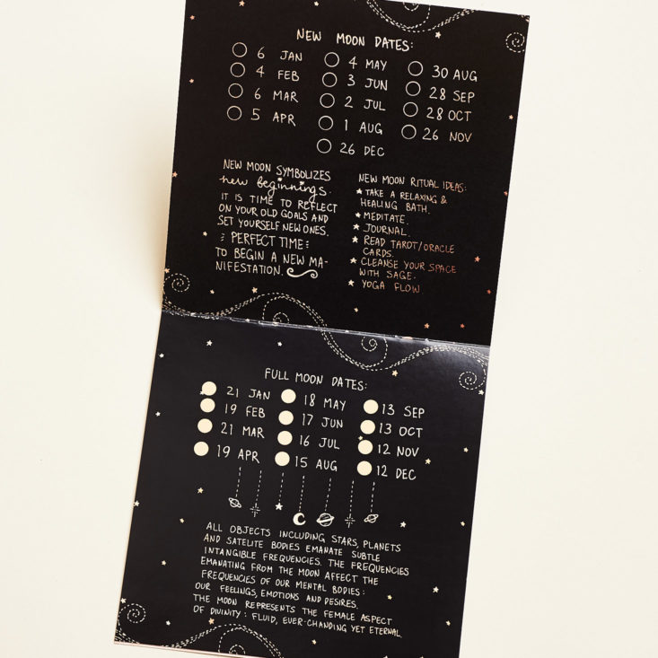 This was the wow piece for me in this box. I have never seen one of these. Selenite is one of my favorite stones and it was also named after the goddess of the moon, Selene, making it the perfect addition to this month. This piece is gorgeous enough to leave out on my coffee table, and in addition to the stones cleansing powers, it makes a gorgeous conversation starter.