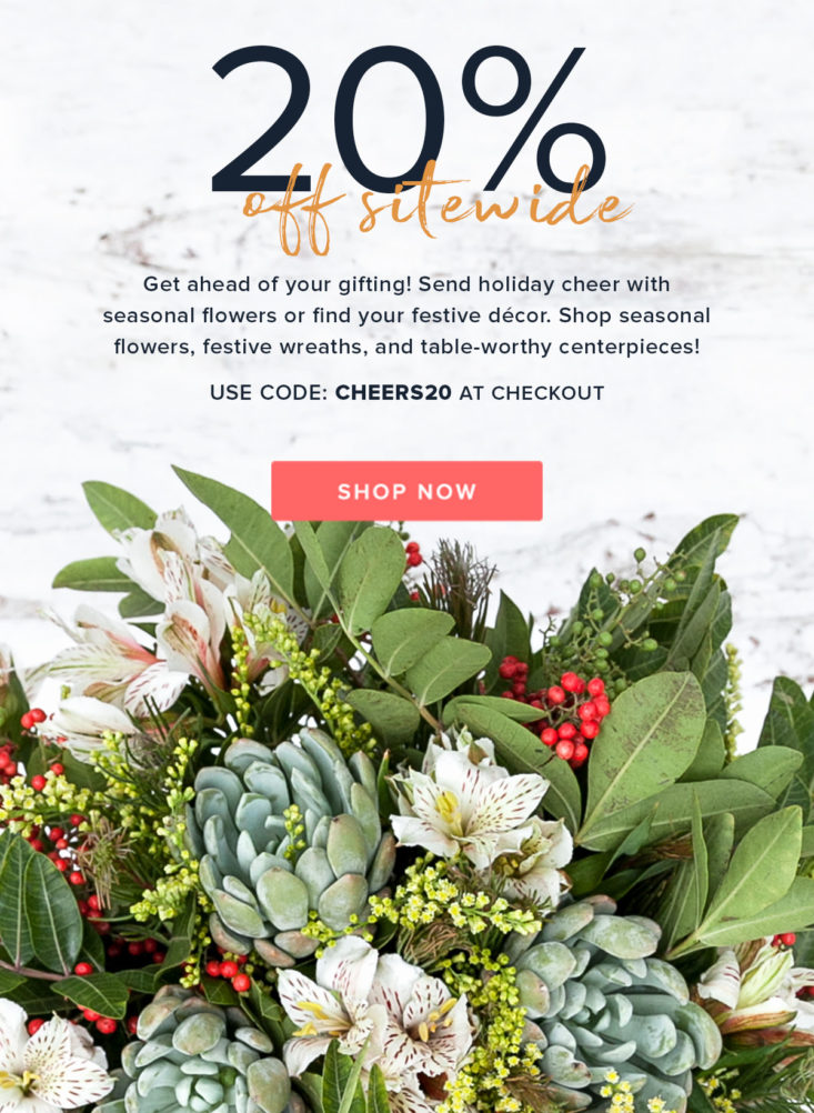For a limited time, use coupon code CHEERS20 to save 20% off all shop orders from The Bouqs!