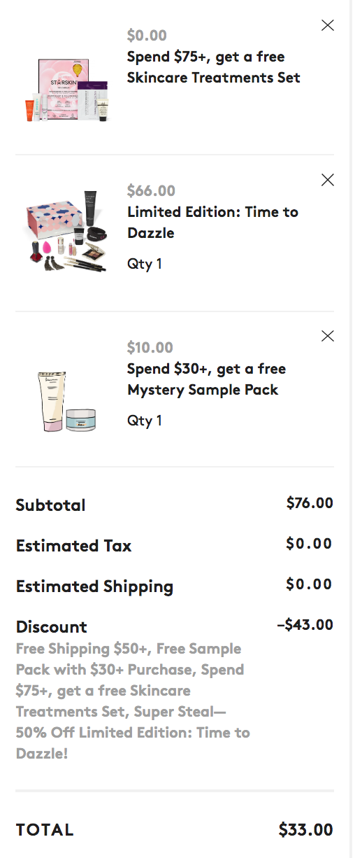 Now for the extra stacking! Even though your cart total after discounts is still $33, thanks to the $10-value sample pack, Birchbox reads your cart total as $76! That means you can pick any of the free gifts from this page. Don't see something you want on that page? Check out the men's free gift page, too. (You can use a free gift offer from that page even if you don't buy anything from the men's section.)