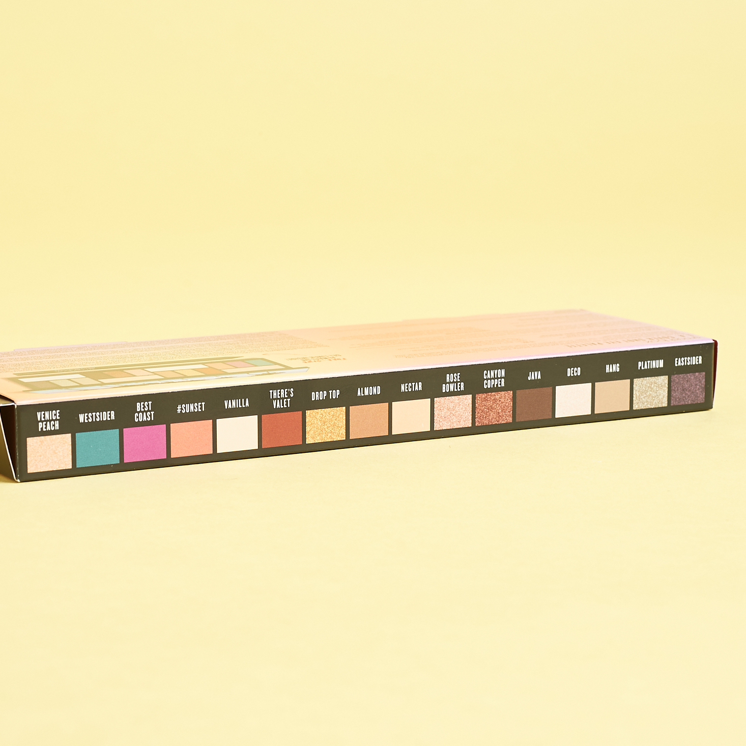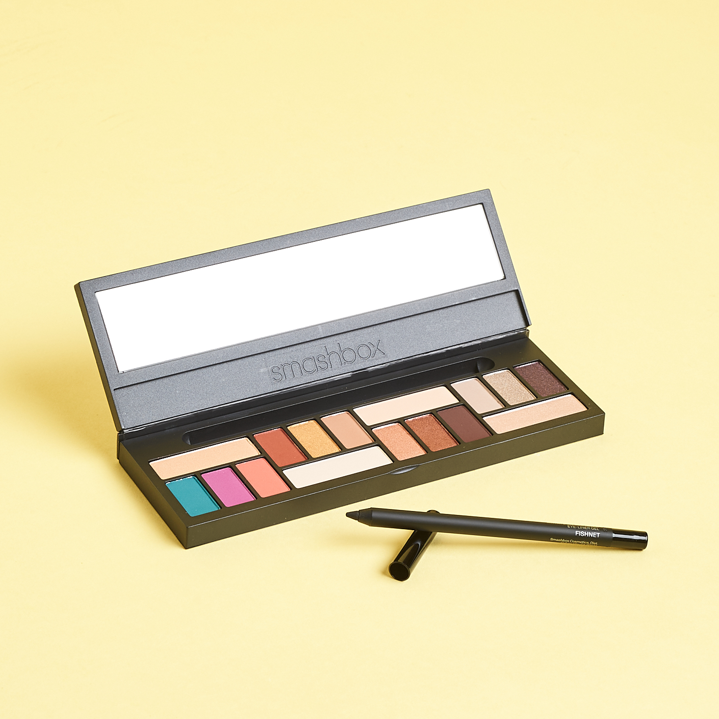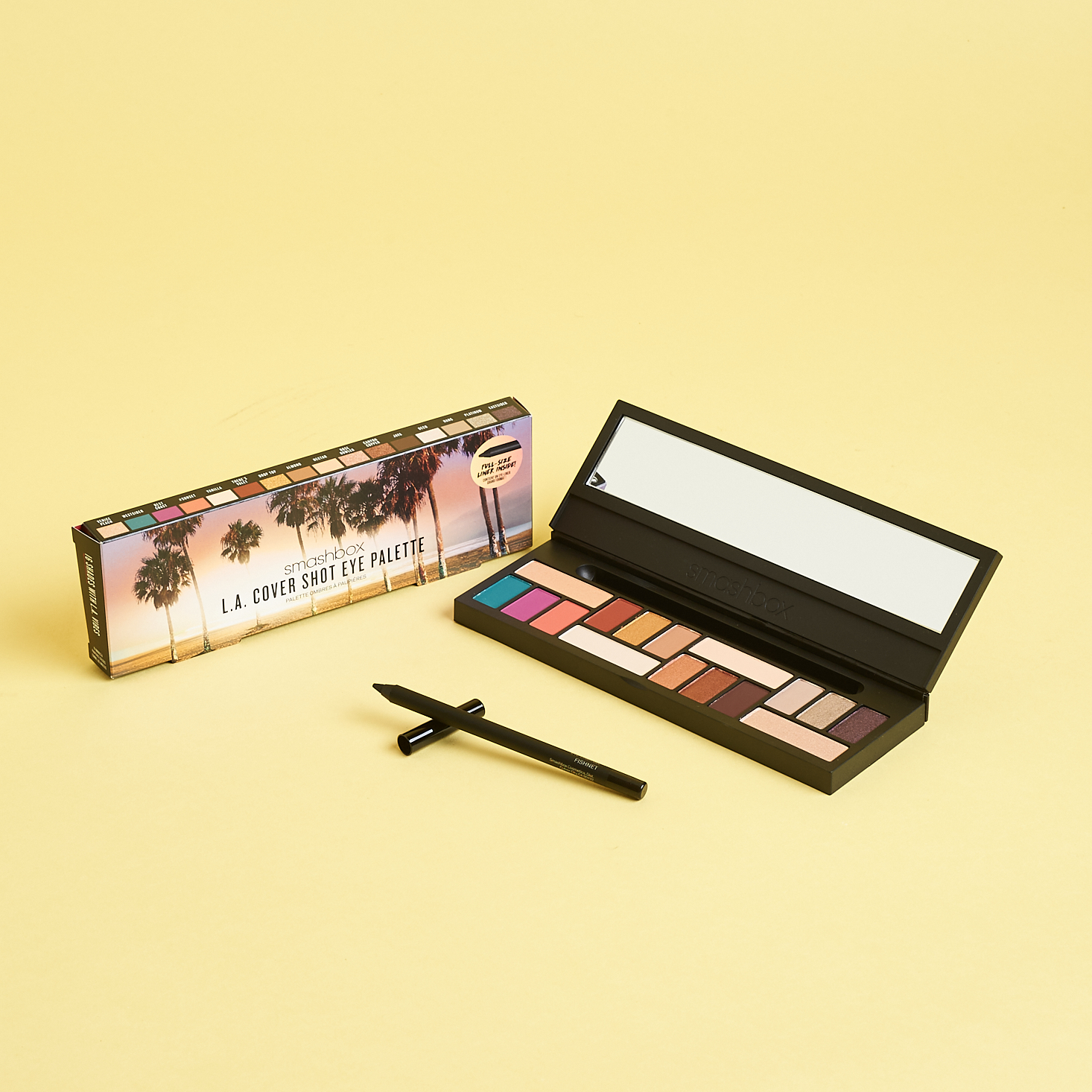 I am really impressed with the color selection within this palette. There are 16 shadows (9 matte and 7 shimmers) and a full-size pencil of the Smashbox Always On Gel Liner in black. Inspired by Los Angles, this palette really has it all: bold brights, shimmering metallics, and soft neutrals. Most of these were super pigmented and smooth, though a couple of the bright mattes felt a little sparse at first and needed some extra layers to really POP. My favorite shades would be Venice Peach, Almond, Rose Bowler, and Hang. Including a full-size liner was a nice touch, and this one is a smooth and rich gel that will complement all of the eye looks created with this palette.