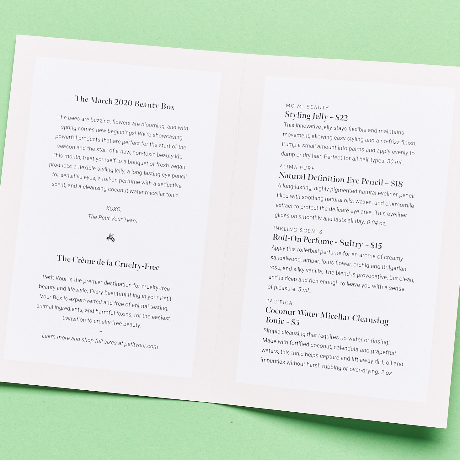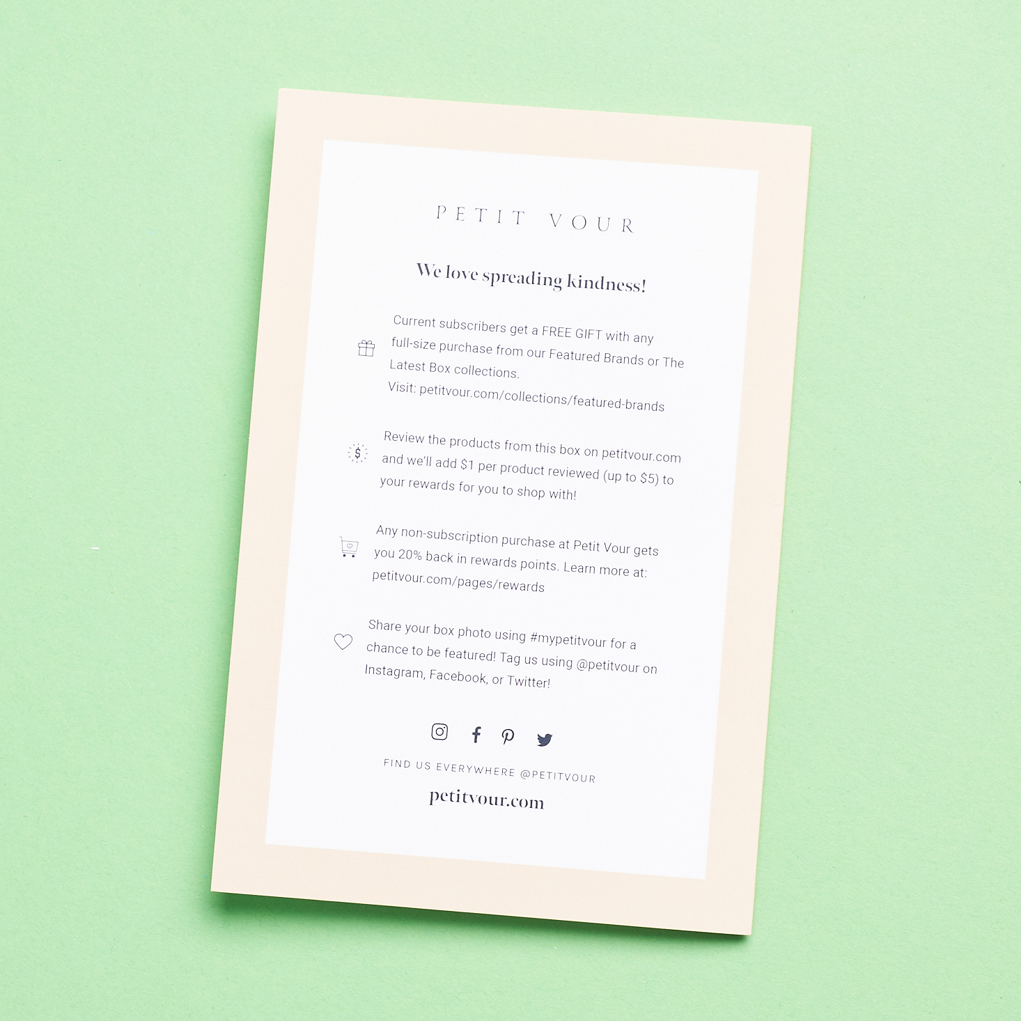 Petit Vour is a monthly vegan beauty subscription box. It’s a great box if you’re looking to try out new vegan and/or natural beauty products.