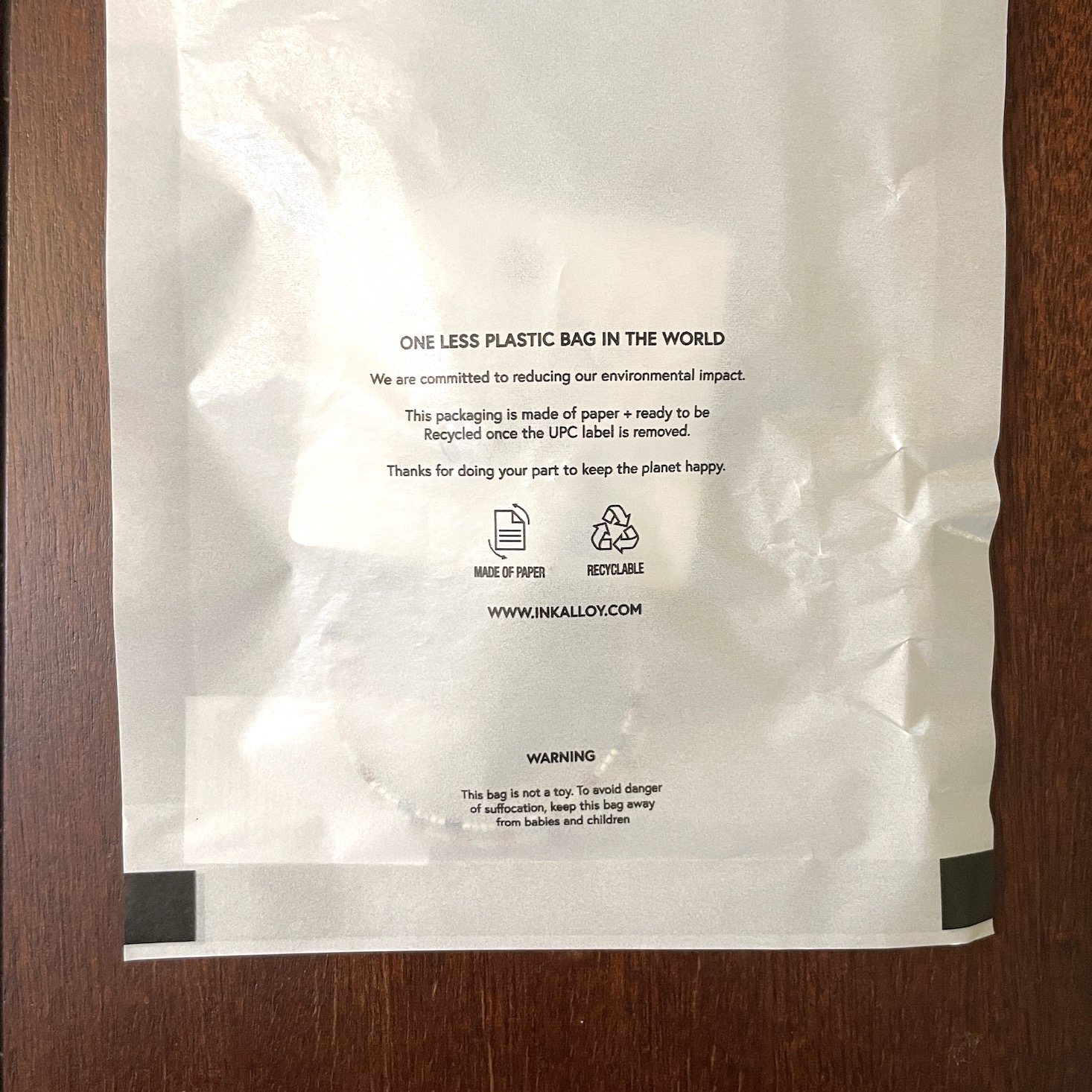 INK+ALLOY subscribers can look forward to the same small white box, typically with their name written on the front. Inside, things were packaged a little differently than usual. First of all, it's another bracelet month—yay!—but also, the earrings got an upgrade from their usual poly bag to a recyclable paper bag. Love it.