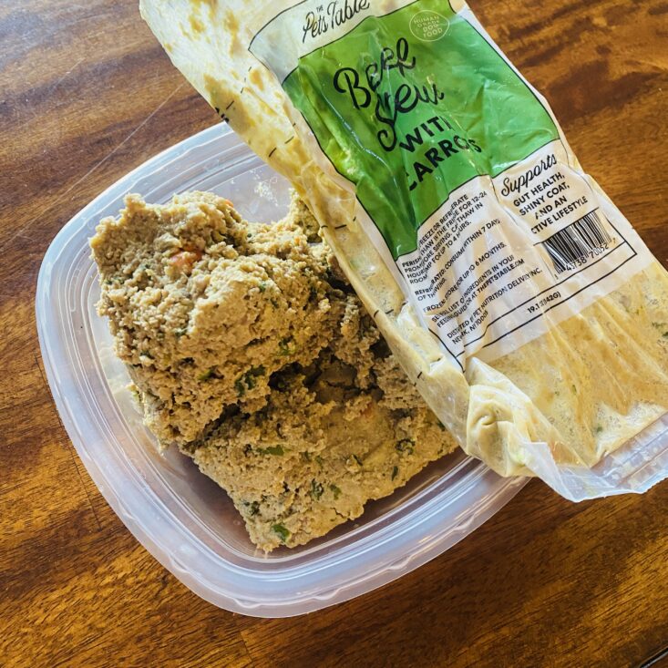 This recipe was another winner! Just like the turkey casserole, it came frozen in portion-controlled packages, ready to be refrigerated and served. Packed with fresh beef, chickpeas, eggs, green beans, carrots, sweet potatoes, beef liver, spinach, sunflower oil, tricalcium phosphate, salmon oil, beet powder, salt, minerals, vitamins, and yeast culture—it honestly sounds like something I’d make for my own family! With a slightly higher crude protein analysis of 13%, it was clear my pups loved this one, and I felt really good feeding it to them!