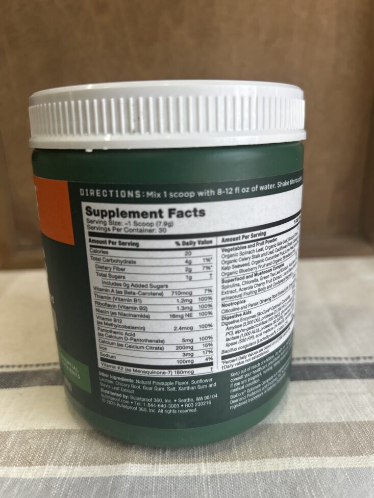 For reference, some of the main food ingredients include organic spinach, organic kale, broccoli, organic celery, cauliflower, cabbage, kelp, organic cucumber, limes, lemons, organic blueberries, and organic strawberries. There are also nootropics like citicoline and panax ginseng, along with digestive enzymes, mushrooms, and more.