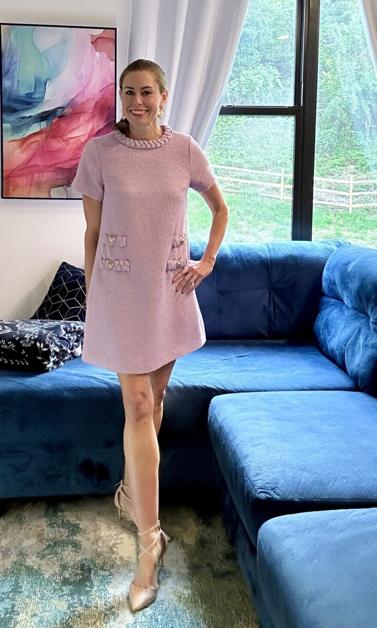 How I styled it: I wore this dress with Saks Off-5th kitten heels, a vintage Chanel bag, and completed the look with two Amazon finds: flower earrings and a skinny gold-tone belt.
