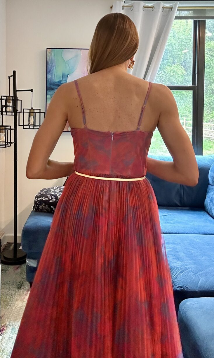 Size and fit: Crafted in pleated mesh, this corset-inspired dress features a colorful abstract print, adjustable spaghetti straps, a sweetheart neckline, tonal binding, back-zip closure, and a swishy pleated skirt.