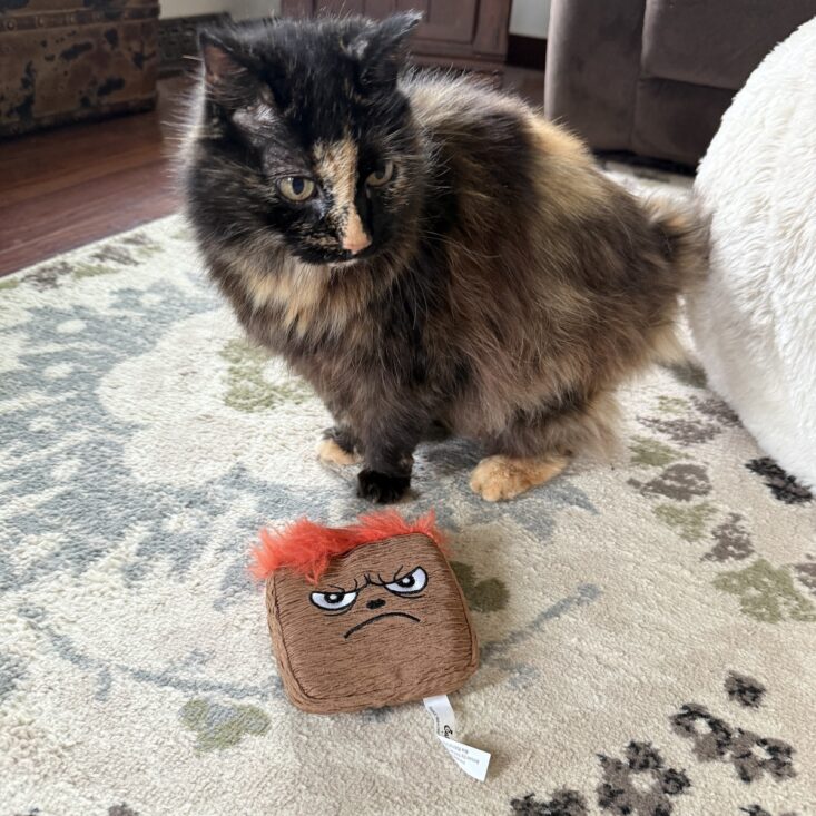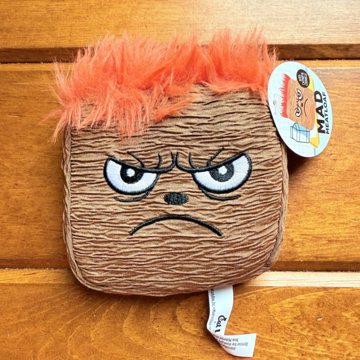 The last toy I received was definitely the best—it was a slice of “Mad Meatloaf.” With a flaming orange, fluffy “sauce” on top of its angry little head, it had a fun texture that felt nice in my hands. It’s a larger toy, which spooked Miley a bit at first, but she gave the fuzzy parts a few curious sniffs. Charlie, on the other hand, used it more as a prop while telling Miley stories—though she seemed a bit unimpressed by the performance.
