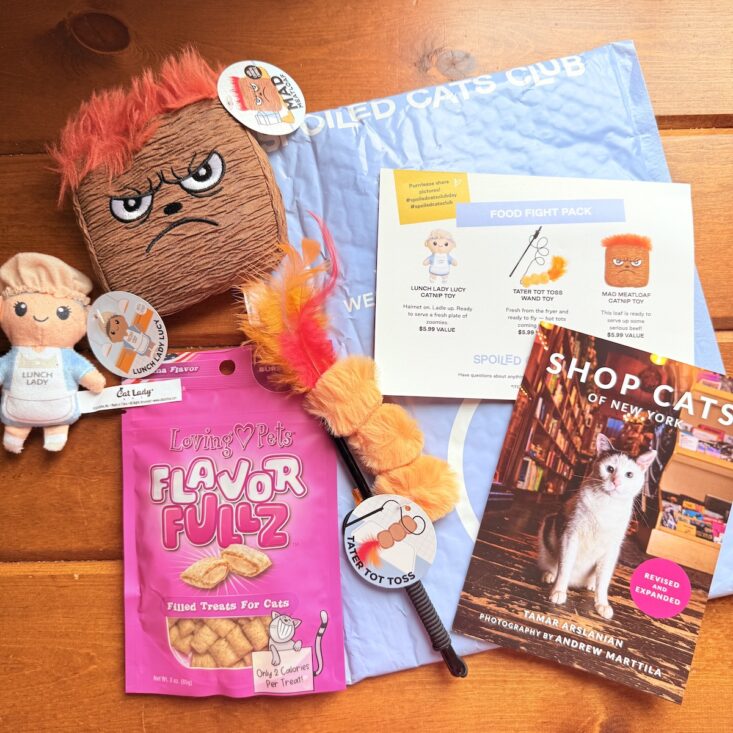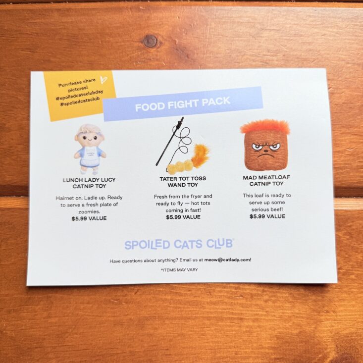 Along with the items, the box also includes an info sheet that clearly states the package is to be delivered to the spoiled cat immediately—and that it is NOT for human kicks and purrs. Cutesy in design, the card also describes each included toy and lists its retail value. I definitely appreciated this month’s "Food Fight Pack" theme—it totally cracked me up!