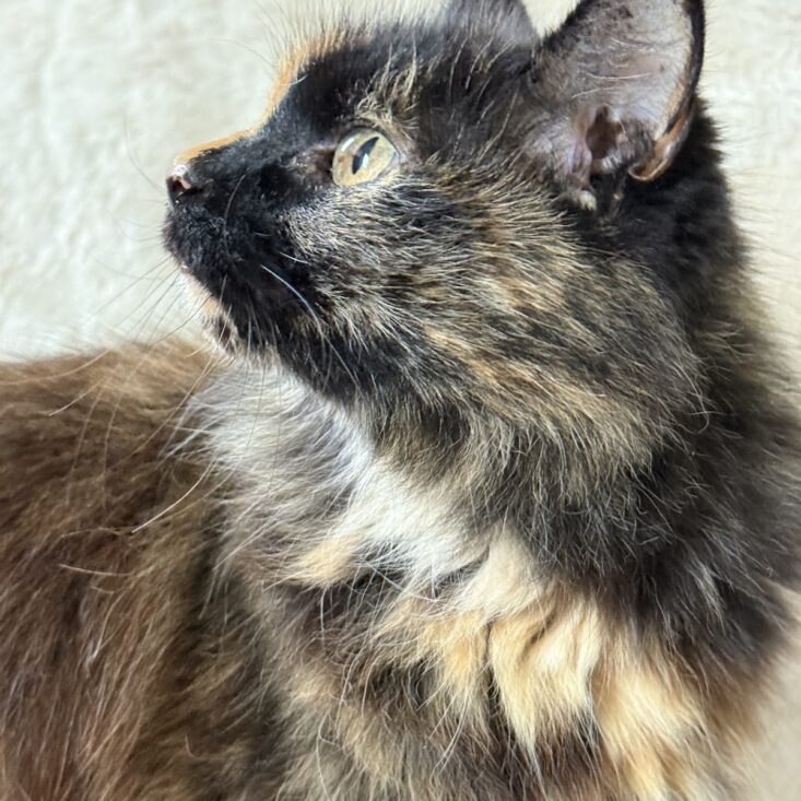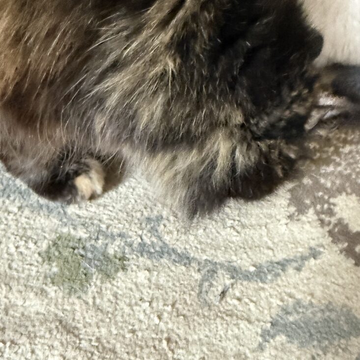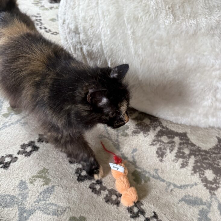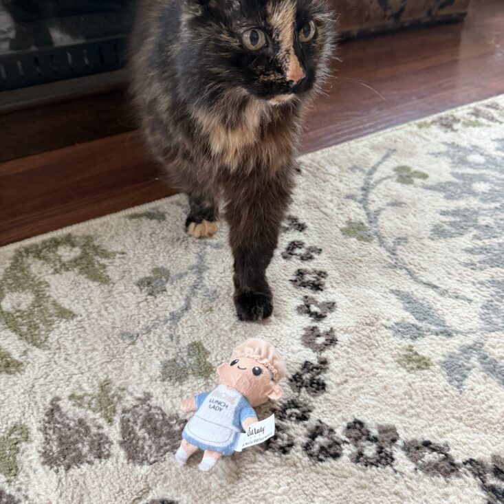 The first toy Miley received was lunch-lady themed—a little catnip-stuffed toy featuring the cutest grey-haired woman who looks like she’d never be crabby! Complete with a hairnet and a cute apron, it was a hit. Charlie enjoyed tossing it around for Miley. While she's getting older, Miley still did a bit of chasing—though she did a lot more sniffing. Catnip tends to make her sleepy, so shortly after playing, she curled up for a nap.