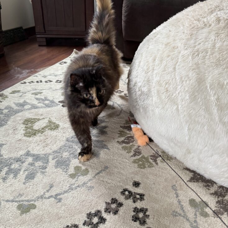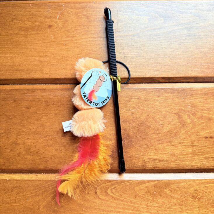Wand toys are definitely Miley’s favorite, but I think my son Charlie enjoyed this one even more. He loved zinging the Tater Tot Toss wand across the living room and watching Miley take off after it. Featuring feathers and three fluffy poms, it’s attached to a stretchy cord that helps it zip quickly across the floor.