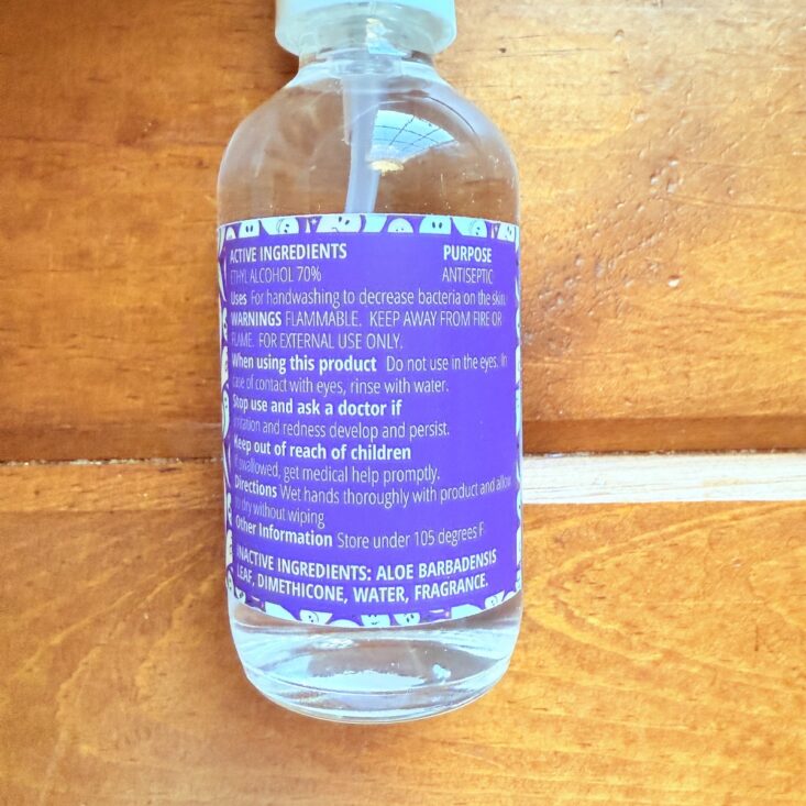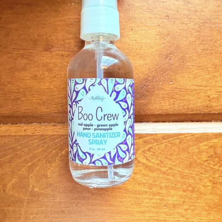 The next item I received was a large spray bottle of hand sanitizer in the “Boo Crew” scent. This light mist contains 70% ethyl alcohol—exceeding the CDC’s recommendation of 60% or more—and includes aloe vera to help prevent dryness. With notes of red apple, green apple, pear, and pineapple, this sweet scent is a joy to use and helps keep our house germ-free throughout the school day. I also love the spray mechanism—it’s easy to use, and the fun scent makes my boys much more likely to use it!