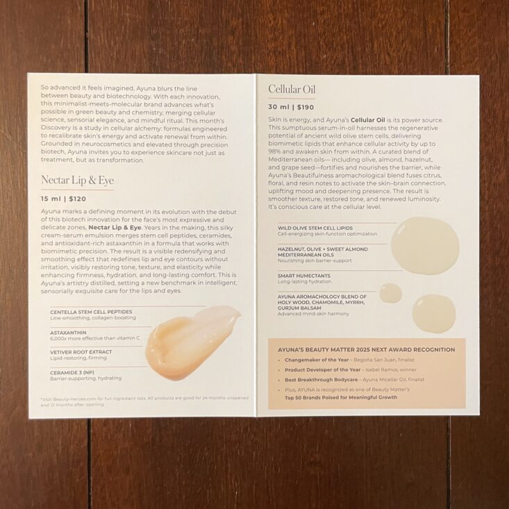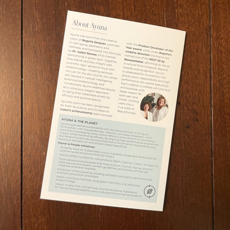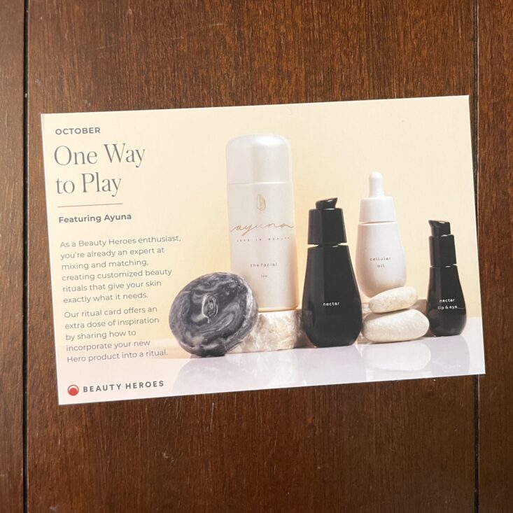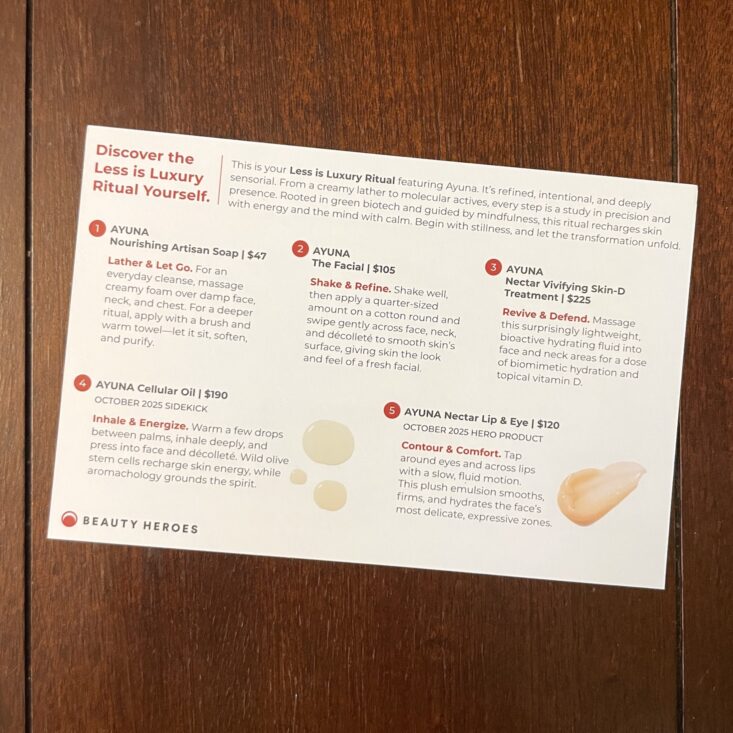 Before we dig in, here's our monthly inspiration for how to work your new products into a ritual. Our last Ayuna delivery was in June 2024, so our last batch of products are long gone and don't show up on this list. If you love what you've received this month and want to stock up on a whole ritual's worth of Ayuna products, this card is a guide to what you'll want.