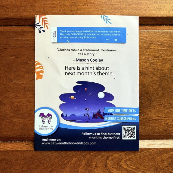 Each month, we receive a beautifully laid-out, color-coordinated pamphlet that describes all the items included in the box. On the back, there’s a featured quote from Mason Cooley: “Clothes make a statement. Costumes tell a story.” There's also a fun little hint about next month’s theme—star gazing, anyone?!