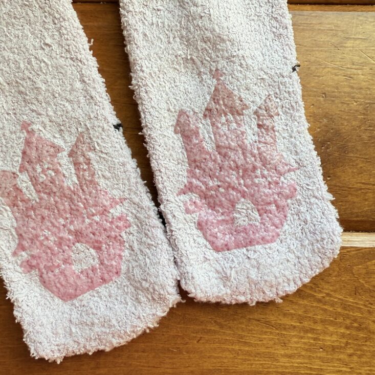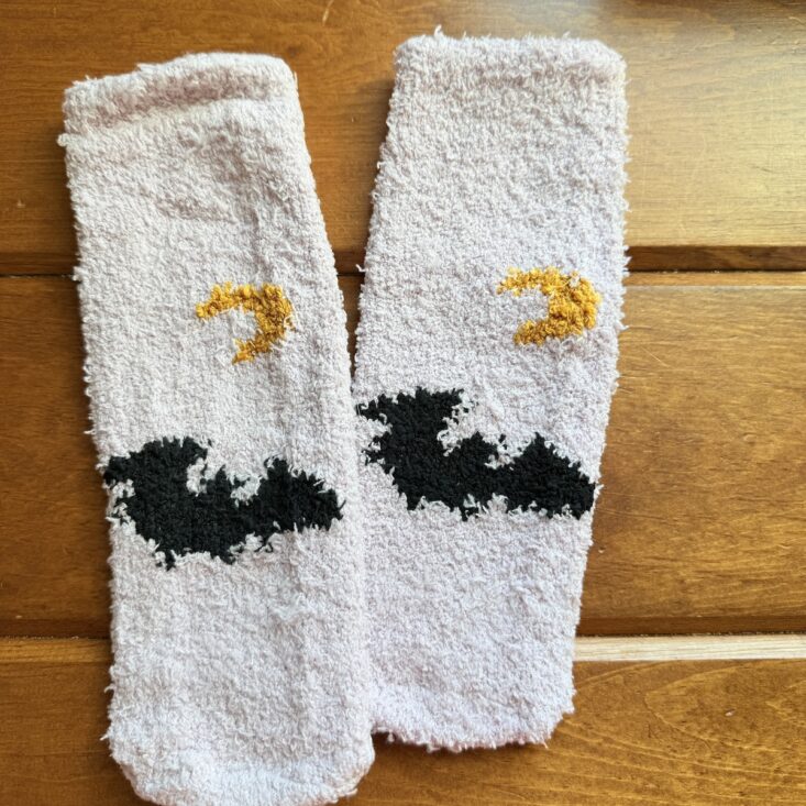 The next item we received was a pair of fuzzy slipper socks featuring bats and crescent moons, with haunted house grip stickers on the soles. Hank mentioned that if they hadn’t been pink, he might have considered wearing them around the house—but instead, he was ready to drop them into the school treat bin. Charlie, however, swooped in and claimed them, completely unbothered by the pink hue. He happily slipped them on after a shower and snuggled up on the couch with a big smile on his face. Looks like another win here!
