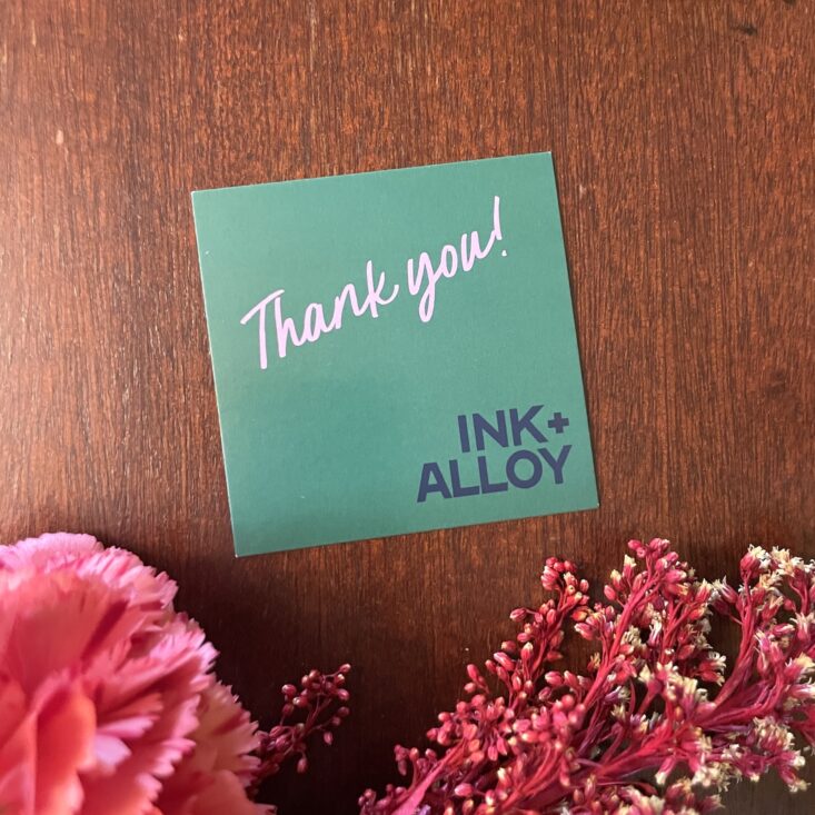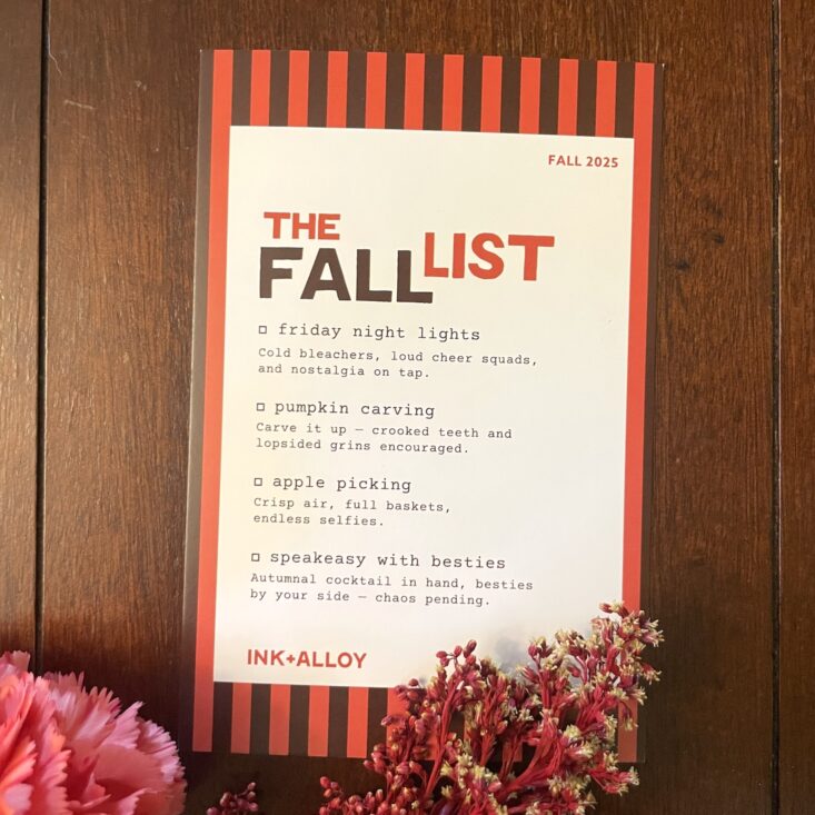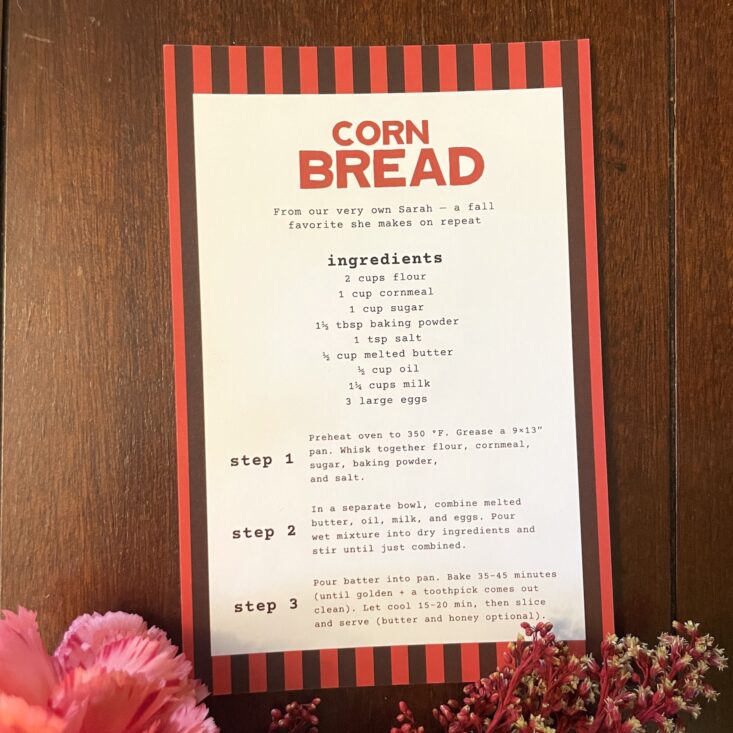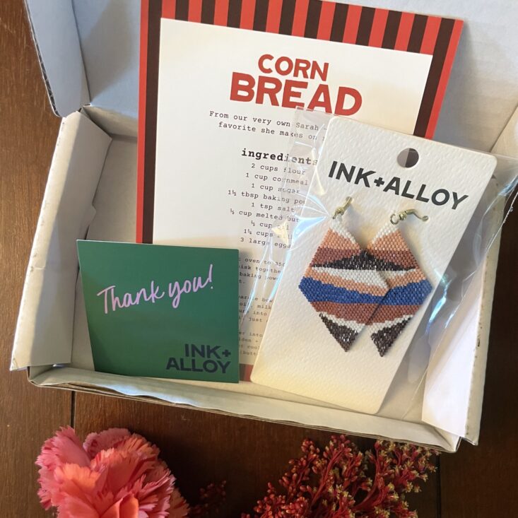 Our delivery doesn't always come with informational materials, but this month we were sent a tiny, square card offering a little intro to INK+ALLOY, as well as a festive card with a Fall List on one side and a corn bread recipe on the other side. Cute!