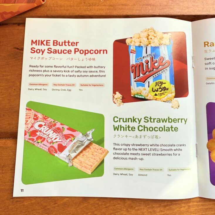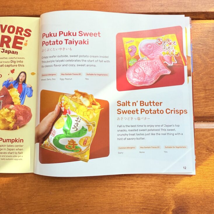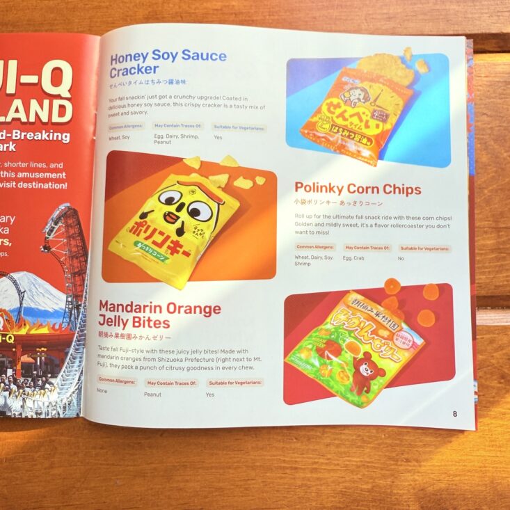 Along with more than a dozen tasty snacks, Tokyo Treat also includes a colorful magazine packed with snack information, cultural information, trivia, facts, and contests! While exact nutritional information isn't shared, (it is on the package, but unless you know how to read Japanese, you're probably out of luck), the pamphlet does include if a food contains a common allergen, what it might contain traces of, and if it is suitable for vegetarians. A great summary of this month's box, my boys loved reading through this guide!