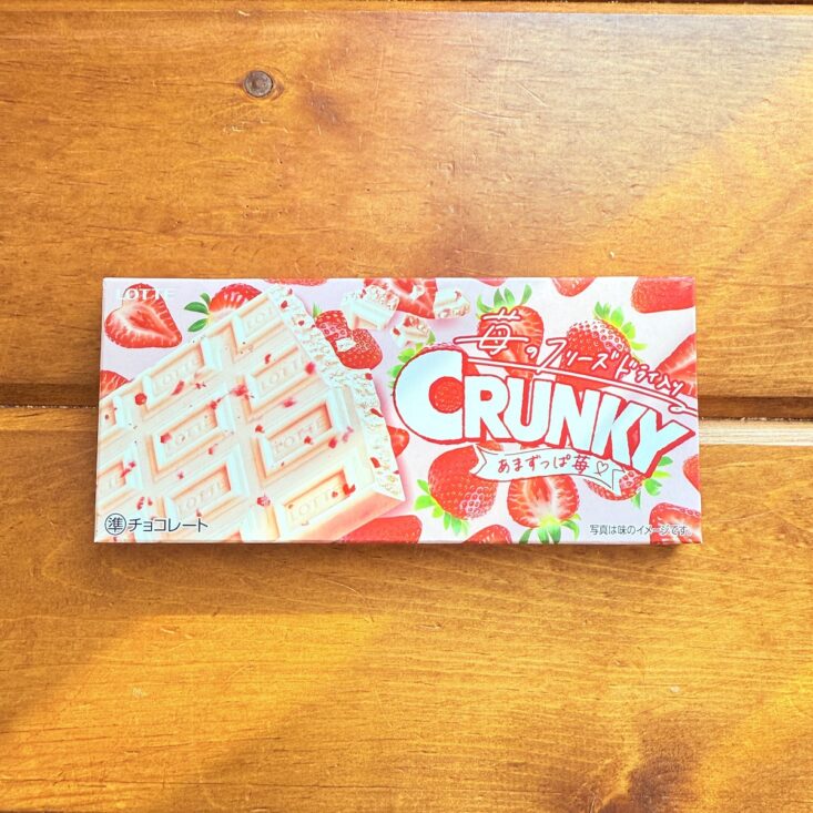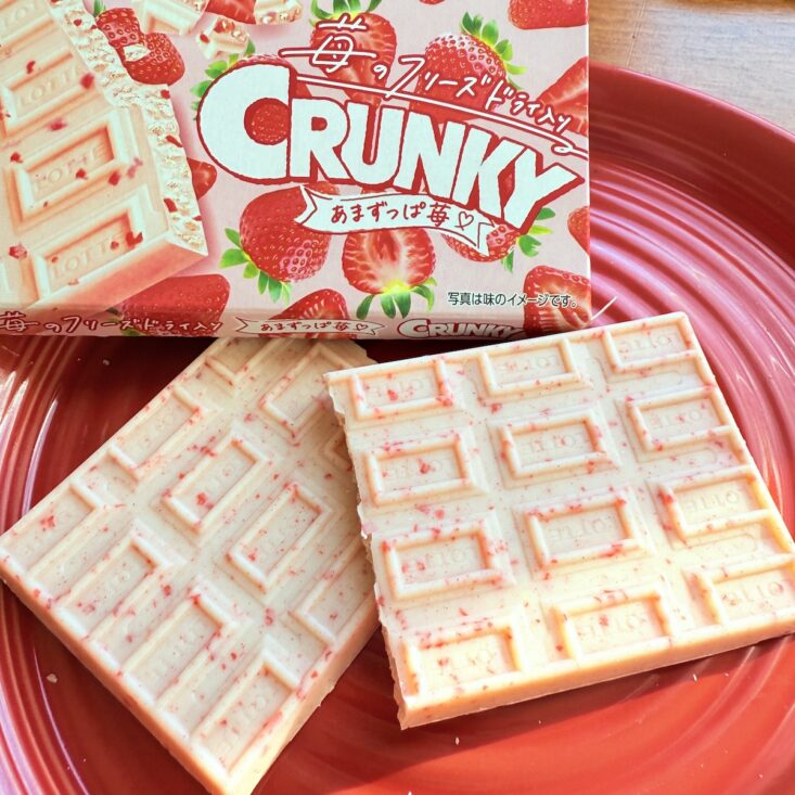 The next item we received was a large, crunchy strawberry white chocolate bar. Generous in size, it reminded me of a Crunch bar from here in the U.S., but made with white chocolate and real strawberry pieces. The flavor tasted more natural than many strawberry snacks, with a hint of tartness that paired perfectly with the sweet chocolate. My sister came over and wanted to try it—and she instantly fell in love with this bar!