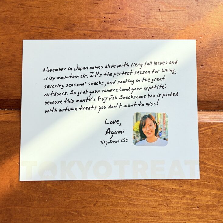To welcome us to TokyoTreat, we first received a cute polaroid type picture with a note from Ayumi, the TokyoTreat CEO. A sweet addition, this truly makes me feel like part of the family! ❤️