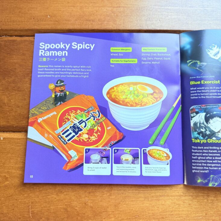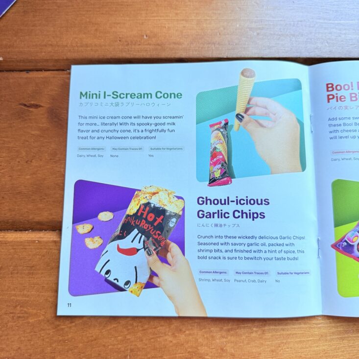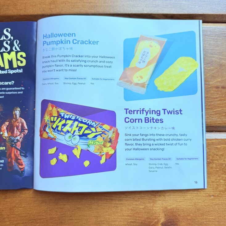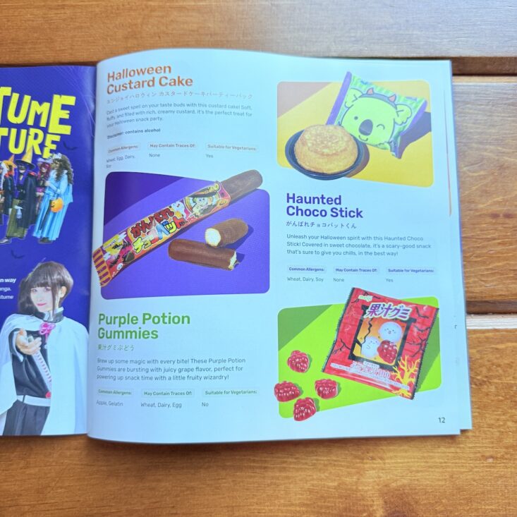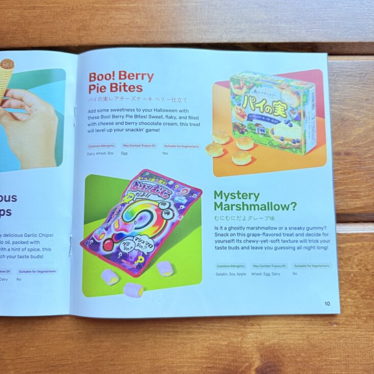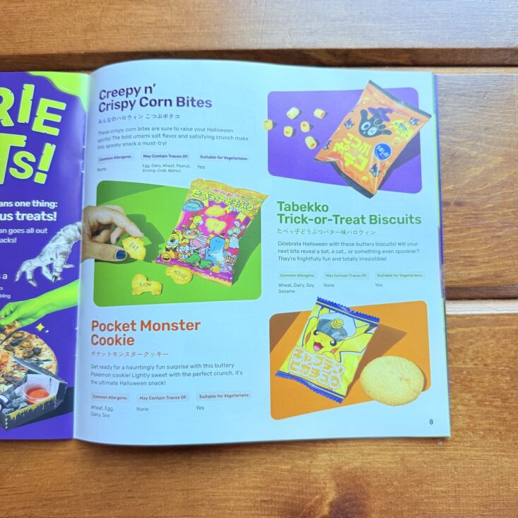 Along with more than a dozen tasty snacks, Tokyo Treat also includes a colorful magazine packed with snack information, cultural information, trivia, facts, and contests! While exact nutritional information isn't shared, (it is on the package, but unless you know how to read Japanese, you're probably out of luck), the pamphlet does include if a food contains a common allergen, what it might contain traces of, and if it is suitable for vegetarians. A great summary of this month's box, my boys loved reading through this guide!