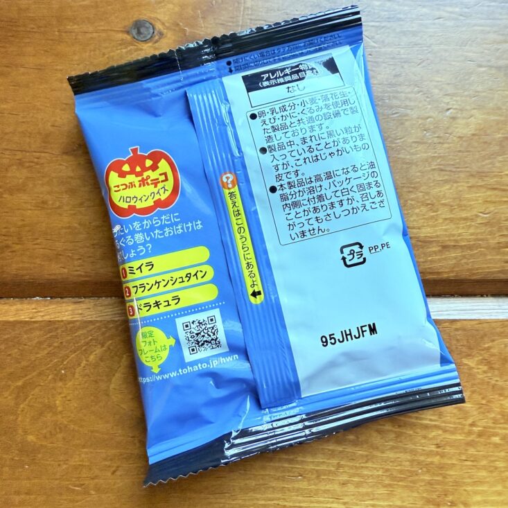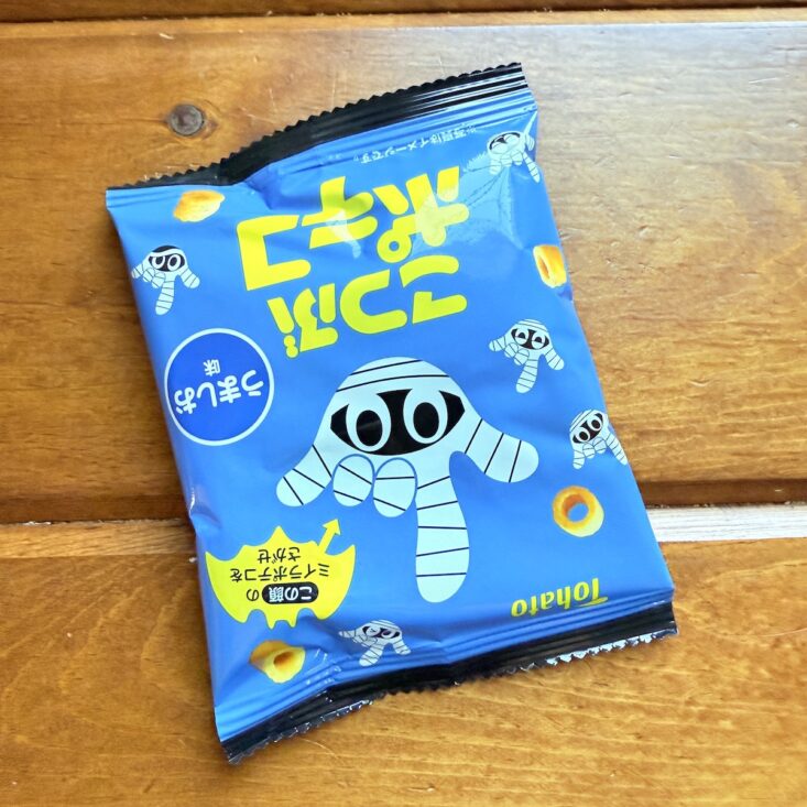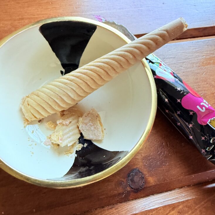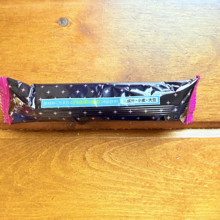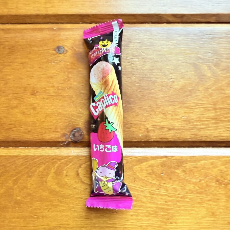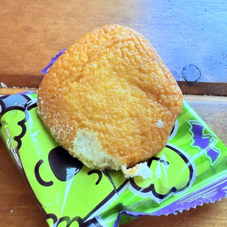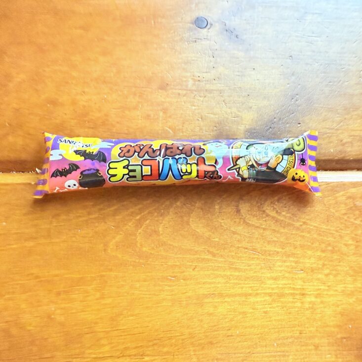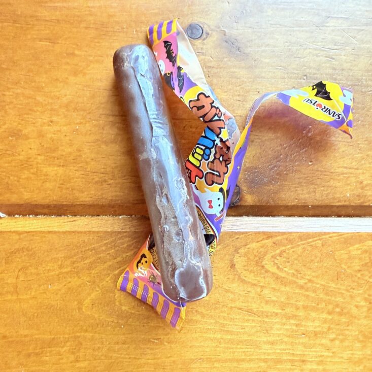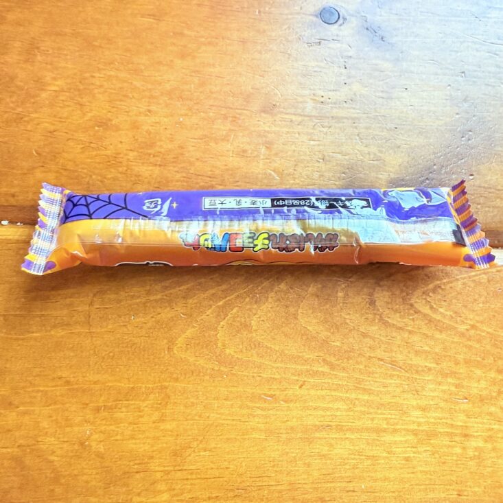 The next snack we received was called the Haunted Choco Stick. This wafer treat featured a crunchy interior with a sweet chocolate coating. We thought the flavor was somewhat similar to a Swiss Cake Roll—but a bit on the stale side. It wasn’t quite as tasty as we had hoped, but we still enjoyed giving this quirky-looking snack a try.