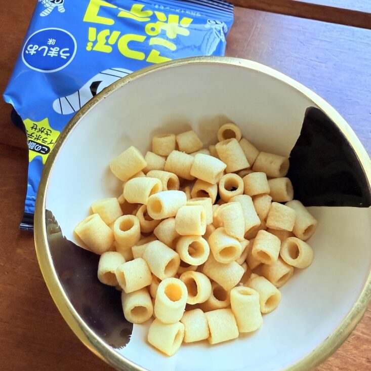 The next item we received was a small pack of crispy corn bites. These uniquely shaped snacks were unlike any American snack we've tried, and my kids especially loved the fun tube shapes. Charlie even joked that he could make an edible chip bracelet—which I might have let him do, but we ate them way too fast! With a salty umami flavor, these crunchy bites hit the savory jackpot. Loved them!