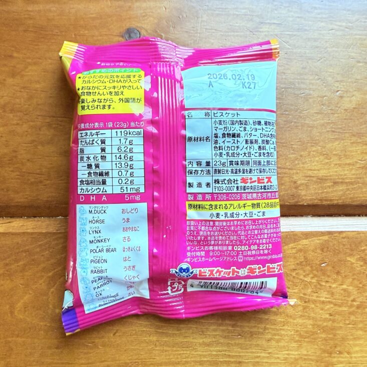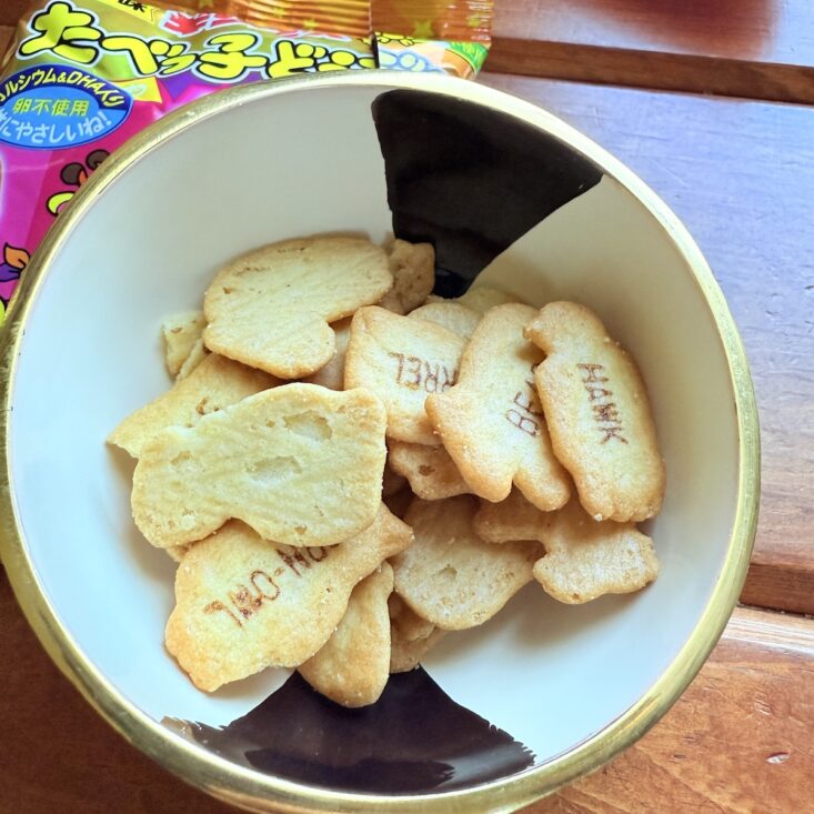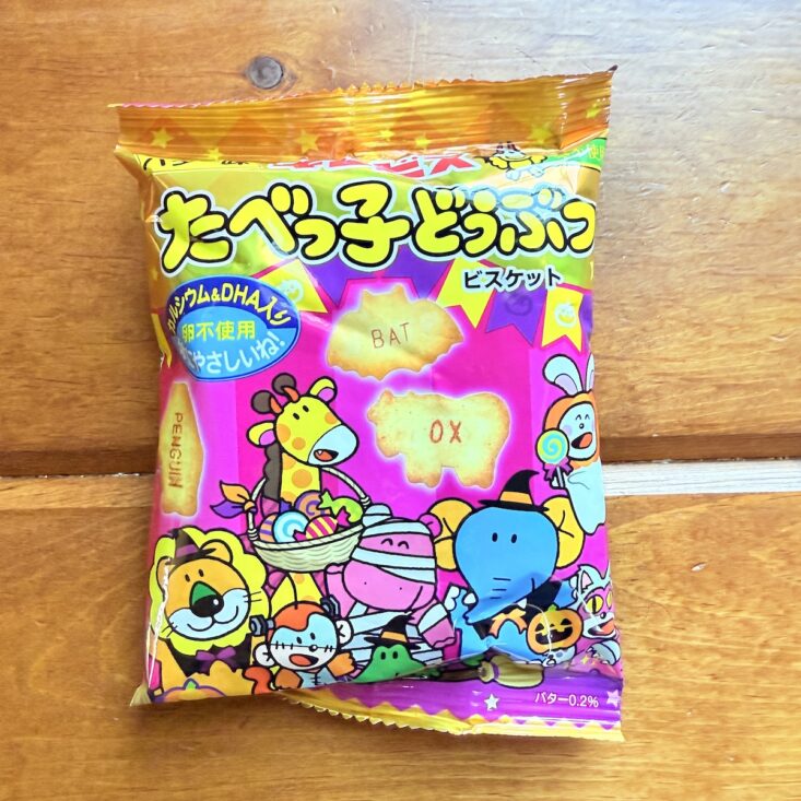I'm pretty sure we've received a similar snack in a past box, but I absolutely loved it—even if it was a repeat! Featuring a cast of animals dressed in Halloween costumes, these little animal cracker-shaped treats even have their English names printed across the middle. It's a fun and tasty way to practice language skills! I’ll have to look into whether other languages offer something similar for learning. With a buttery crispness and a flavor that's slightly sweet and savory, our whole family enjoyed this snack.