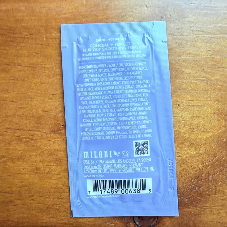 The last item I received was another foil packet—this one containing a sample of Milani primer. While I do enjoy a good primer, I really dislike foil packets, and this one was no exception. The top tore open messily, making it difficult to get the product out cleanly. That said, there was plenty to use, and I did like the formula; it helped create a smoother base for my foundation. I saved the rest overnight to use the next day, but it dried out and didn’t feel as nice. I’d love to receive this product in different packaging in the future, but I still appreciated the chance to try it. At a full-size price of $13.97, it wouldn’t break the bank if I decided to try the full size version—but seriously, I just can't stand those foil packets!