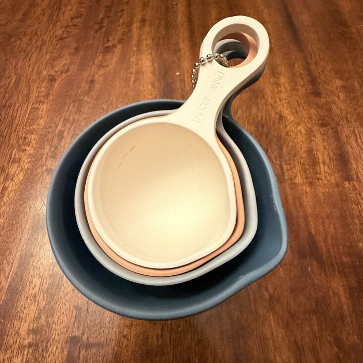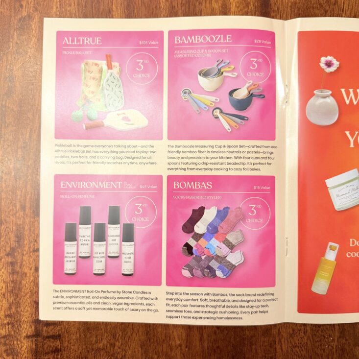 The third category also included five different options: Sea Salt Shimmer Spray, a Pickleball Set, Measuring Cups, Roll-On Perfume, and Bombas Socks. Had I been given the choice, I would have picked the measuring set—and that’s exactly what I received! I love this eco-friendly bamboo fiber set; the neutral colors are gorgeous, and the quality is excellent. I’d been limping along with an old set, so this was a really nice upgrade, and they work beautifully. Easy to wash and attached with a ball chain, they stay together nicely and store well. Overall, I’m extremely impressed!