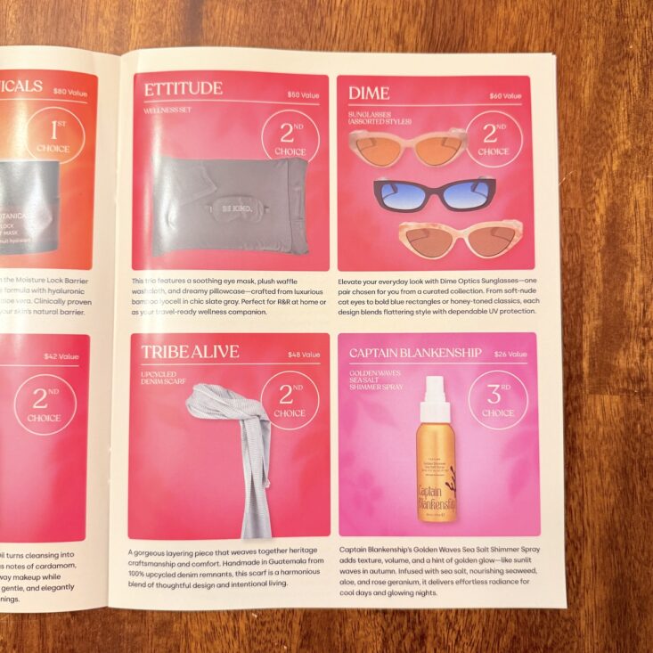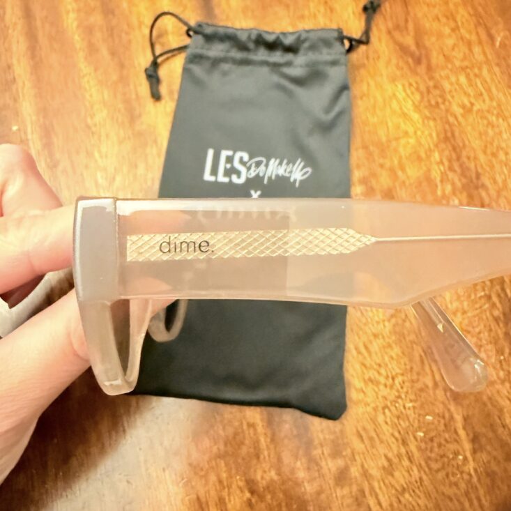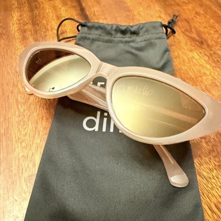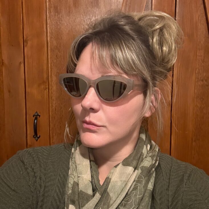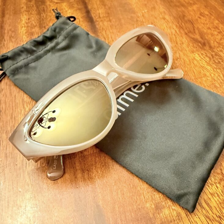 In the second category, there were five options to choose from, with values ranging from $40 to $60. Once again, I didn’t get to make my own selection this season, but I did receive the highest-value item—a pair of Dime sunglasses. These cat-eye glasses feature a tan plastic frame with polarized lenses. The quality is impressive; they’re well made, with sturdy, thick arms that feel comfortable to wear. Channeling a vintage 1950s–1960s vibe, these sunnies were a fun addition to my accessory collection, and I was happy to stash them in my car for bright, sunny mornings.