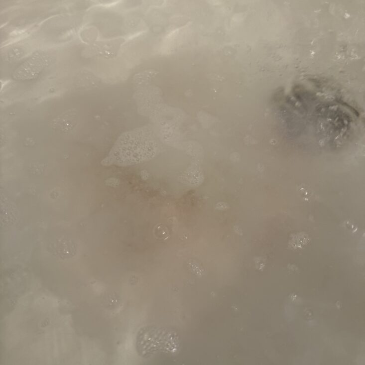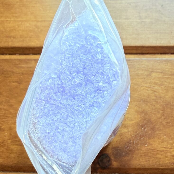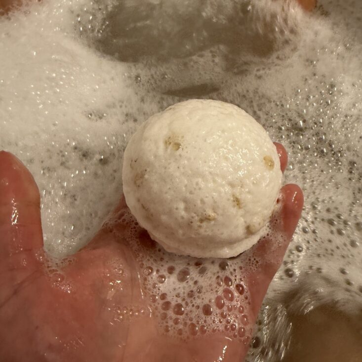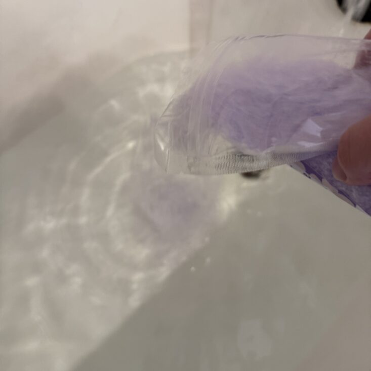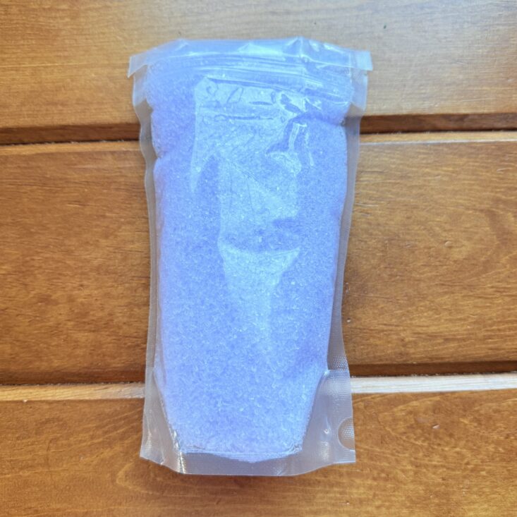 The next item we received was a nicely sized, resealable pouch of bubble salt. I love this inclusion because, like the bubble bath, it can be used for multiple baths. It has a light, earthy scent that’s incredibly relaxing. I especially love the salt because it leaves my skin feeling soft and refreshed after drying off. A fun addition to my tub, this has really helped me unwind and calm down before bed.