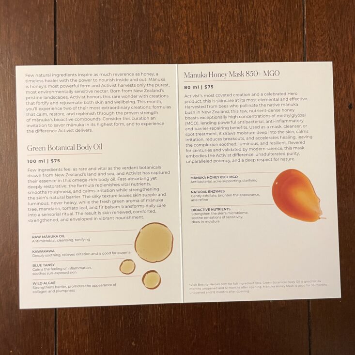 This Beauty Heroes delivery featuring ACTIVIST has magic in it—the kind that makes people ask what you’re doing differently. Both the Raw Mānuka Oil Body Serum and the Mānuka Honey Mask are beautifully crafted, elemental treatments that feel indulgent yet grounding, straight from nature. They complement each other effortlessly: one for nourishing the body, the other for renewing the face. This box costs $58.95, and together these two products retail for $185—an incredible value from a brand that consistently overdelivers on purity and performance.