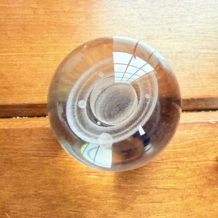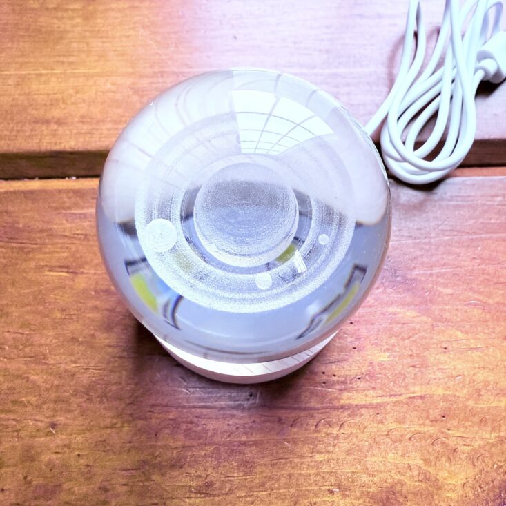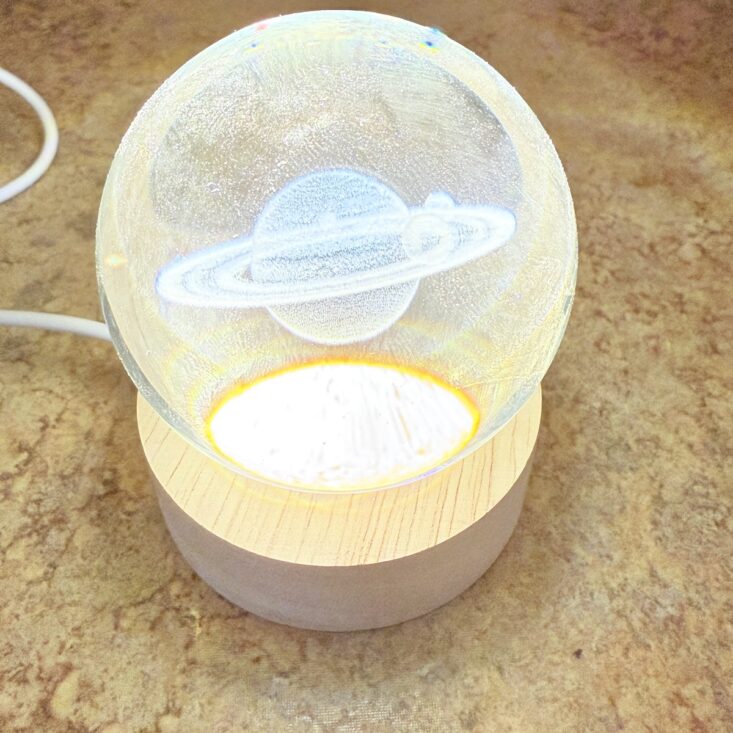 The next item we received was a cute little Saturn light-up sphere. It comes with a wooden base and a glass ball. When plugged into a USB port, the light shines through the sphere, making Saturn appear to float inside the glass. Charlie loves little light-up items like this, so he was excited to place it in his bedroom as a charming night light.