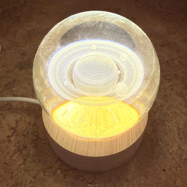 The next item we received was a cute little Saturn light-up sphere. It comes with a wooden base and a glass ball. When plugged into a USB port, the light shines through the sphere, making Saturn appear to float inside the glass. Hank loves little light-up items like this, so he was excited to place it in his bedroom as a charming night light.