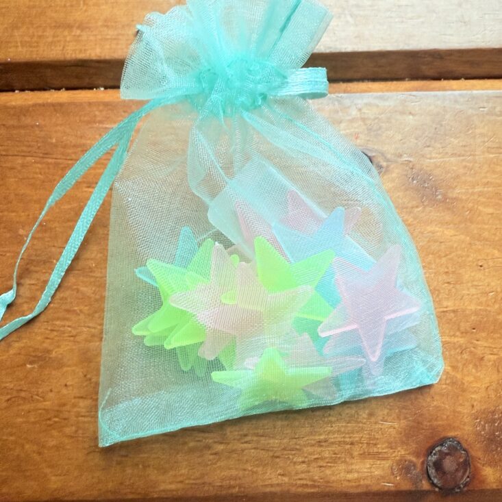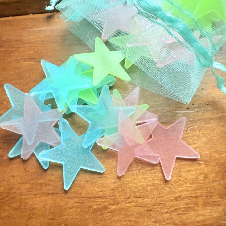 The last item Hank received was a pouch of glow-in-the-dark stars with sticky tape. These were super popular when I was a teen, and Hank loves them just as much. For now, he has them sitting on his dresser glowing, since I’m a little hesitant to stick the tape to his ceiling due to past experiences. Overall, though, this was a great inclusion that fit the theme perfectly!