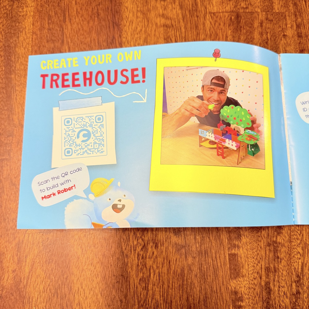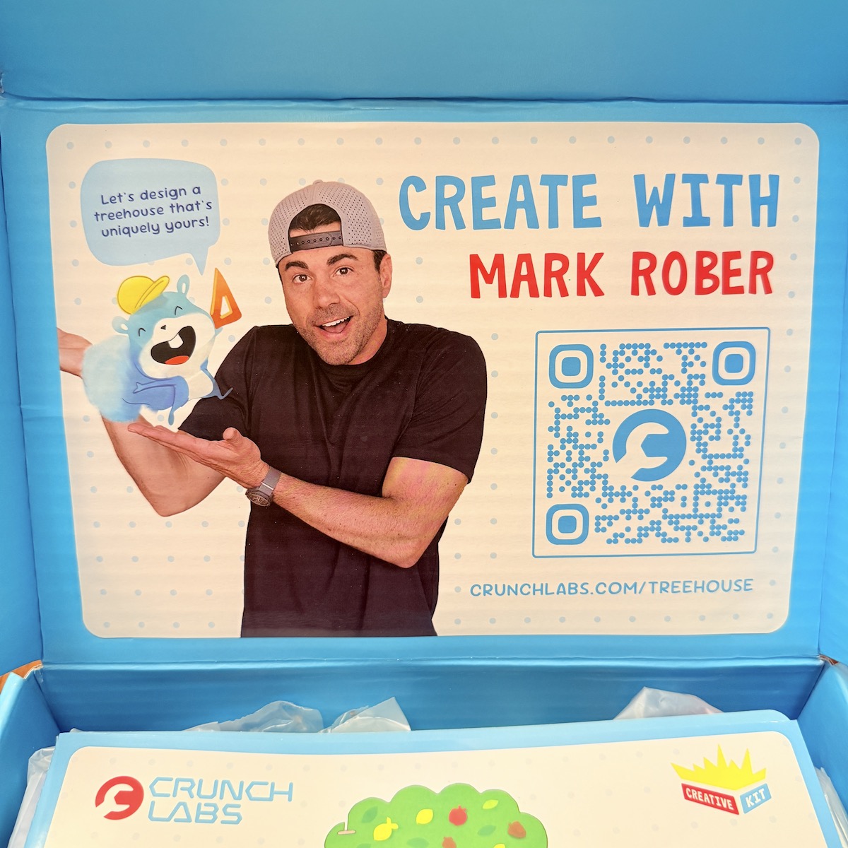 Along with the treehouse kit, we received a little wooden board to keep track of which boxes we’ve completed and a QR code linking to a Mark Rober video. The video provides step-by-step instructions on how to build the treehouse and shares details about a mini-movie competition! Charlie was so inspired that he created his own movie to try to win a platinum ticket to visit CrunchLabs and meet Mark Rober. What fun!