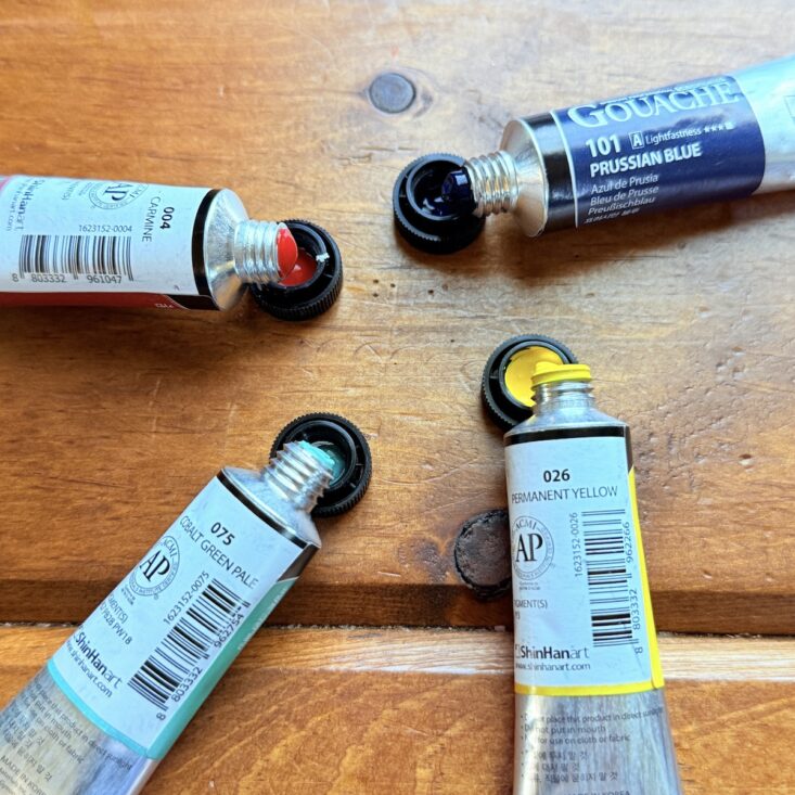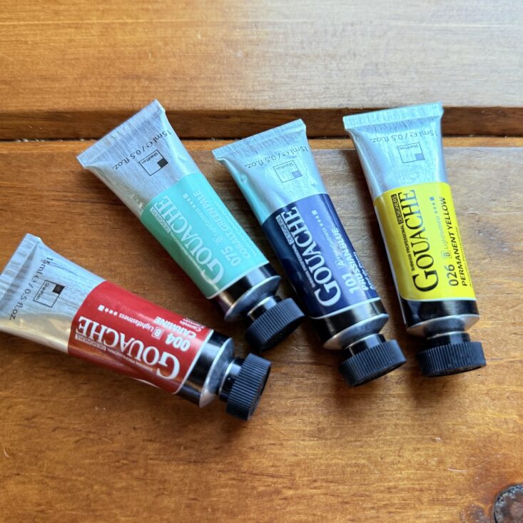 The first item we received was definitely the showstopper! Inside was a set of four professional designer gouache tubes by ShinHan. These 15 mL tubes are generously sized and packed with plenty of product. The pigments are rich and absolutely dreamy—this set included Permanent Yellow, Cobalt Green Pale, Carmine, and Prussian Blue. Similar to watercolor, gouache is a fascinating medium that offers a wide range of thicknesses and hues. The colors blended beautifully to create even more options and proved to be incredibly versatile. A fantastic start to this box!