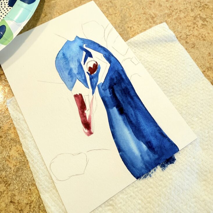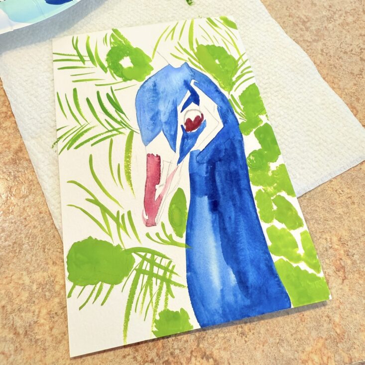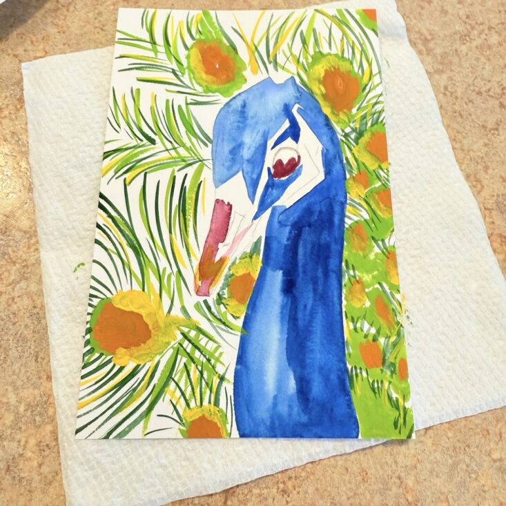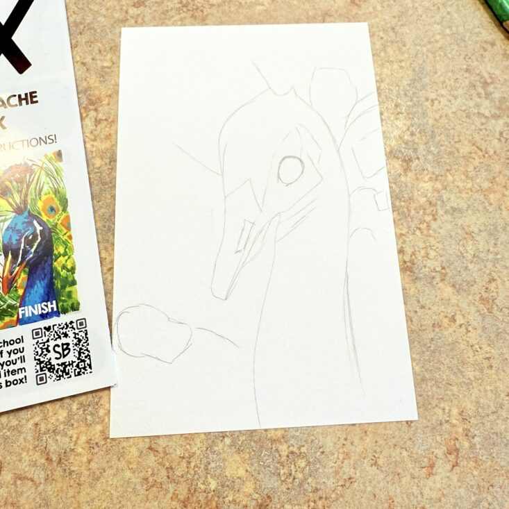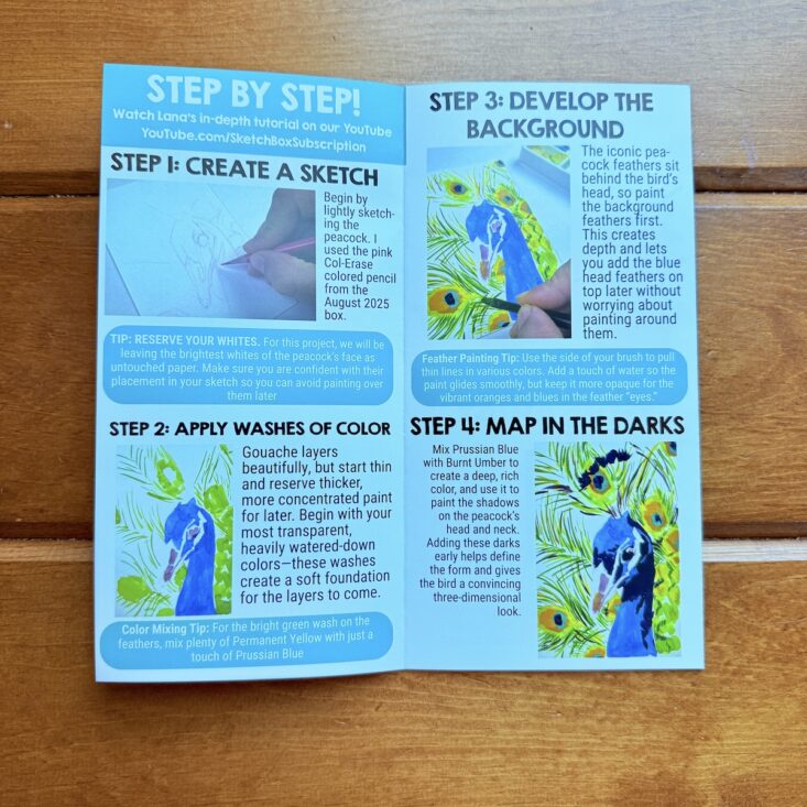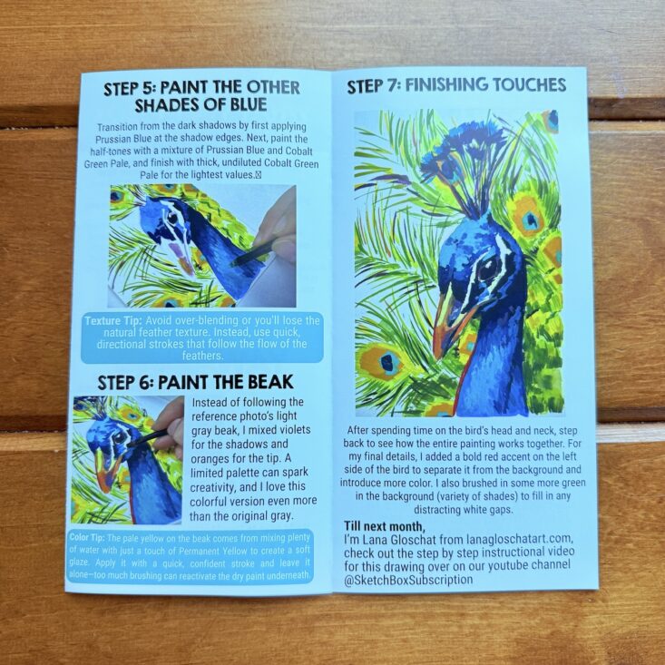 I have to say, I was thrilled to see a peacock on the front of this month’s pamphlet—especially because it came with step-by-step instructions! While a video tutorial was also available, I decided to follow the written directions, and I was actually really happy with the results. I started by sketching the outline with a regular pencil, then applied a light wash of color. Following the pictures and written instructions, I used the included brush and added heavier layers of gouache, mapping out the darker areas first. Next, I layered in the different shades of blue and painted the beak. Once finished, I used the brush to add detailed strokes of color along the feathers. While it’s not perfect, I’m proud of how my peacock turned out—and I had so much fun experimenting with a medium I’ve only used a few times before.
