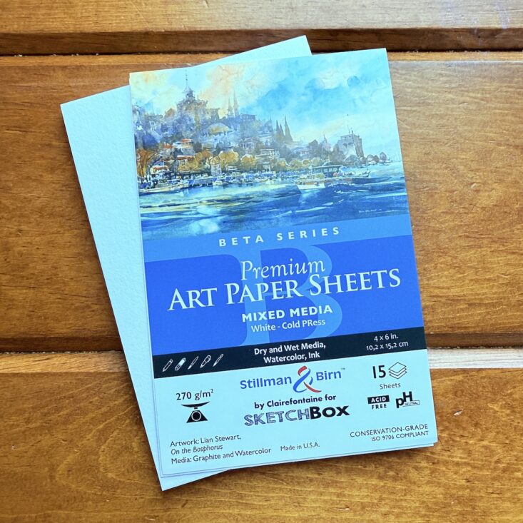 The last item I received was a 15-sheet pad of cold press mixed media paper by Stillman & Birn. The bright white color contrasted beautifully with the included gouache tones and held up wonderfully without folding or curling when wet. It was a perfect pairing with this month’s items, and I can’t wait to use it to create some Christmas postcards for friends and family!