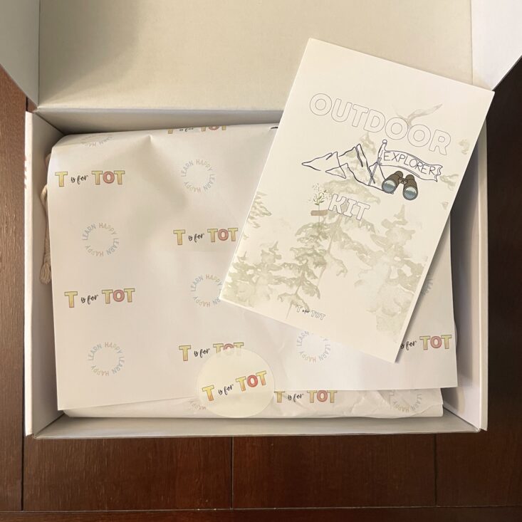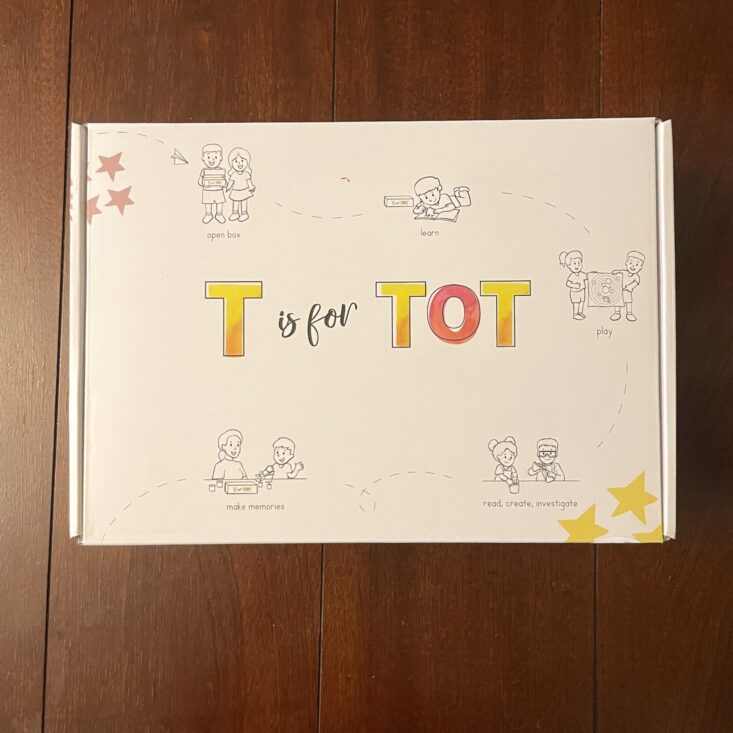 T is for Tot arrives in a white box with a sticker indicating the month's theme on the flap. The box is stuffed with possibilities on the month's theme, and on top is a trifold information card with descriptions and ideas for play.