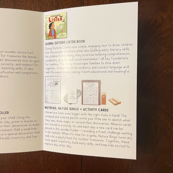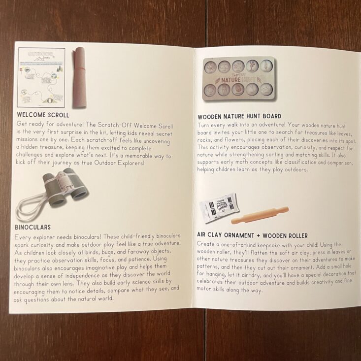 Value Breakdown: The Outdoor Explorer T is for Tot box contains 8 activities, but each one contains lots of opportunity for exploration and play. The activity booklet comes with page after page of themed ideas. The scavenger hunt board and binoculars can be used endlessly. The clay tools will be added to our art supplies, and the book to our shelf. There's both initial novelty and staying power to these boxes. The value is absolutely accounted for.