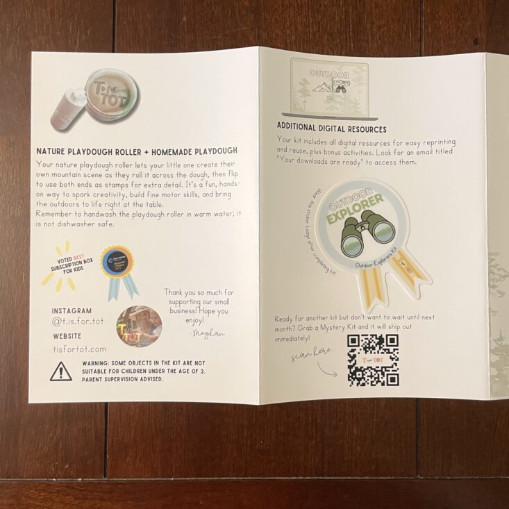 As always, the T is for Tot info booklet gives a description of various activities in the box, but it's just as suited to open-ended, child-led play. There are tons of options for what families can do with the materials. On the back of the card here is a sticker badge that coordinates with the theme of the box—this time it's Junior Geologist—and a QR code you can scan to buy a mystery kit before your next box arrives.