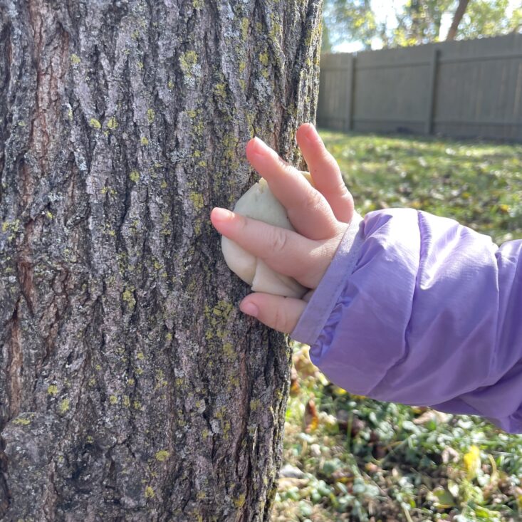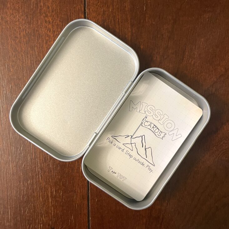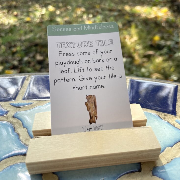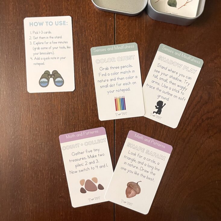 This small tin is great to keep in the car or in an adventure bag, or to take camping. Its cards span four categories of engaging with nature, offering ideas for using all five senses to enjoy your environment. The first one we pulled suggested using the included playdough to make a tree bark imprint. My four-year-old thought that was so cool!