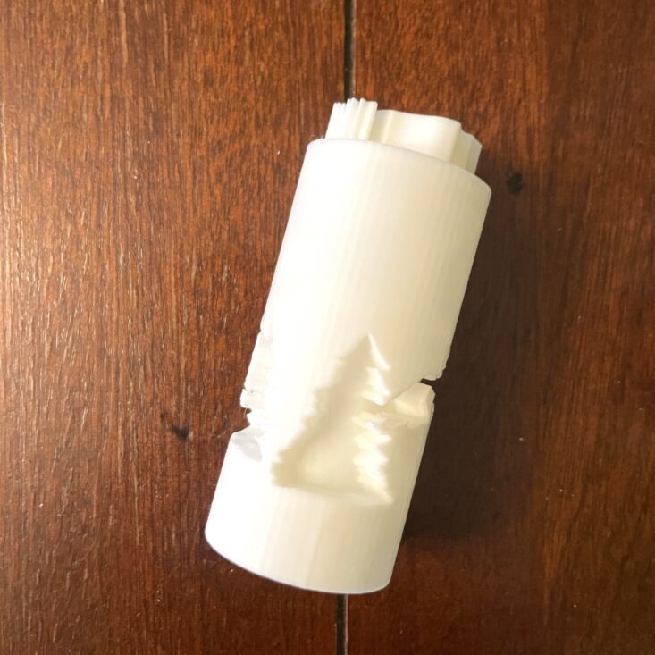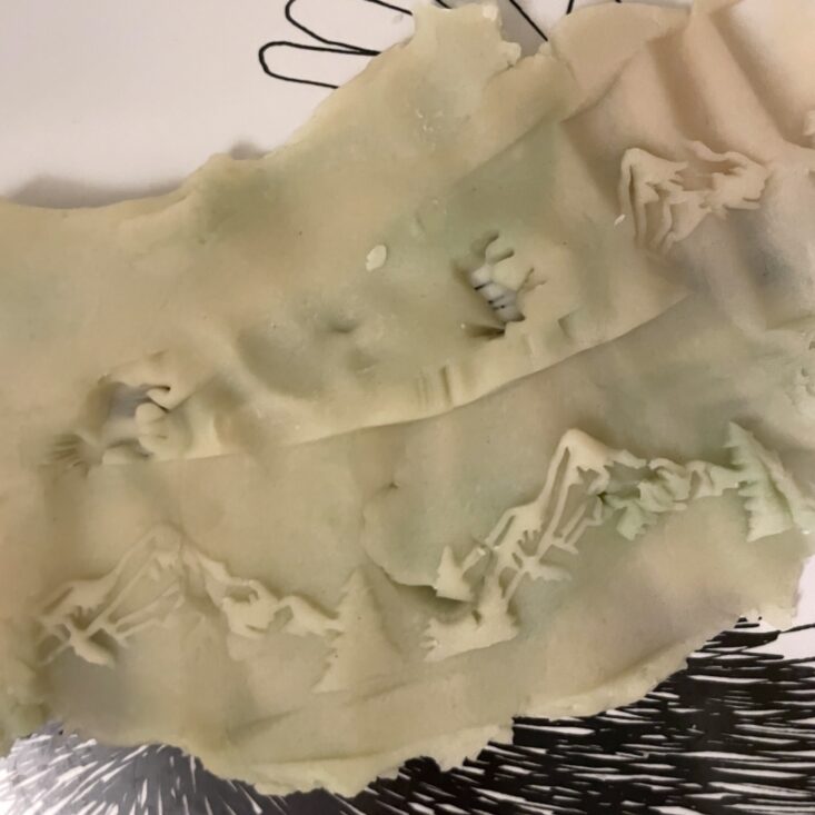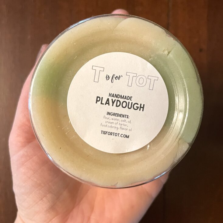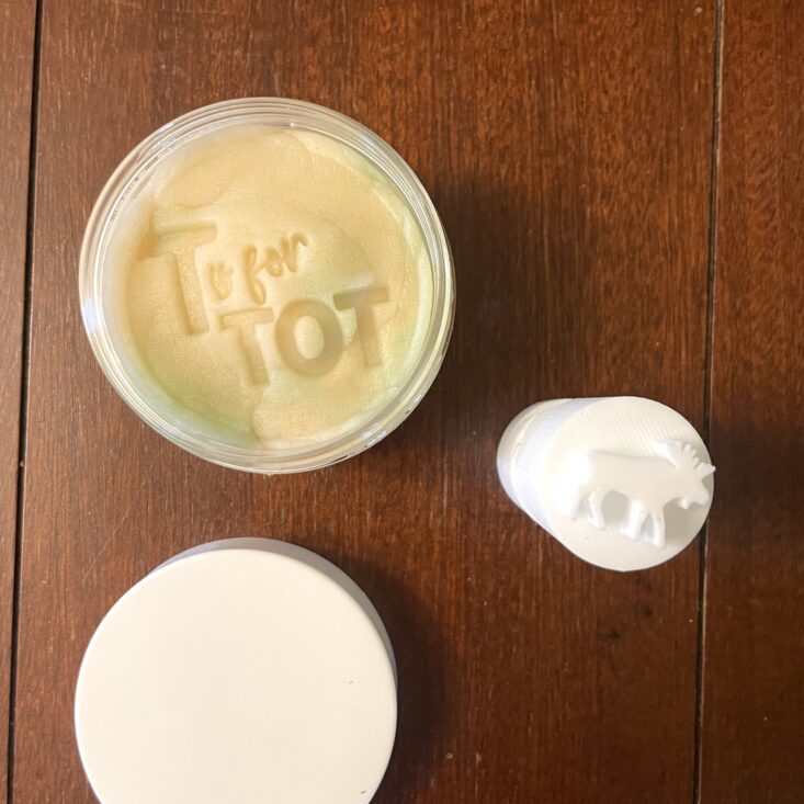 Every T is for Tot kit comes with homemade playdough and a 3D-printed tool to use with it. This month it's a cool roller that leaves a scene of mountains and trees. On the end there's a moose stamper. So fun!