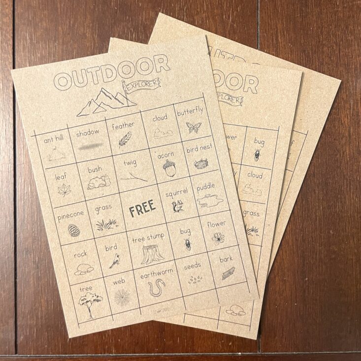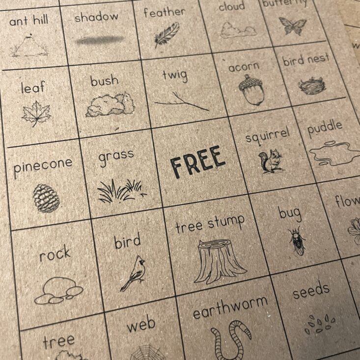 Having these bingo cards packaged in an envelope really upped the element of anticipation. Just one of many expert teacher/parent touches that are a hallmark of this box! There are three bingo cards included, so it can either be used as three different bingo outings, or for a little friendly competition among siblings.