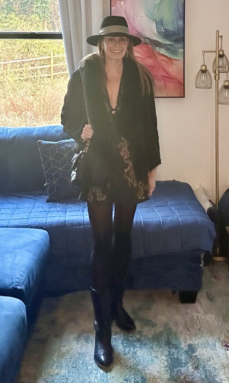 I paired it with Tecova cowboy boots, a fedora, Les Belles tights, the Chanel 19, and an Yves Salomon shearling jacket.