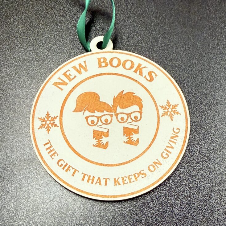The first item we received this month was a really cute customized ornament. It features the “beTWEEN the Bookends” characters and the quote, “New Books: The Gift that Keeps on Giving.” Cute in design and nicely sized, this laser-cut ornament is painted white and finished with a green ribbon. Our Christmas trees are pretty much maxed out with ornaments right now, so Charlie brought it to school and hung it on my lamp. Super cute—it added the perfect touch of festivity to my desk!