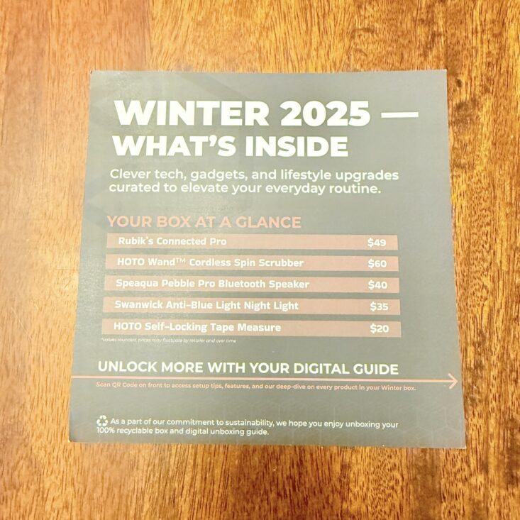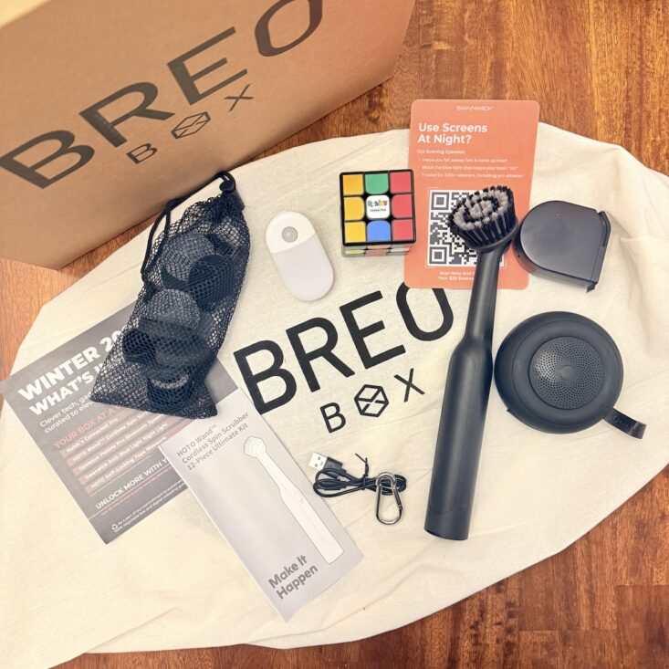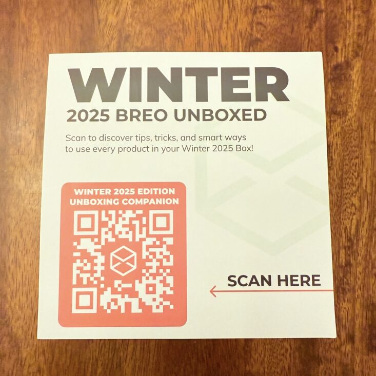 Kicking off this quarter’s box, we received a sturdy card with a QR code. Scanning it takes you straight to the BREO Box website, where you can check out all the included items! From detailed descriptions and retail values to photos and extra info, it’s the perfect way to learn about everything in the box and how to use it. Super handy!