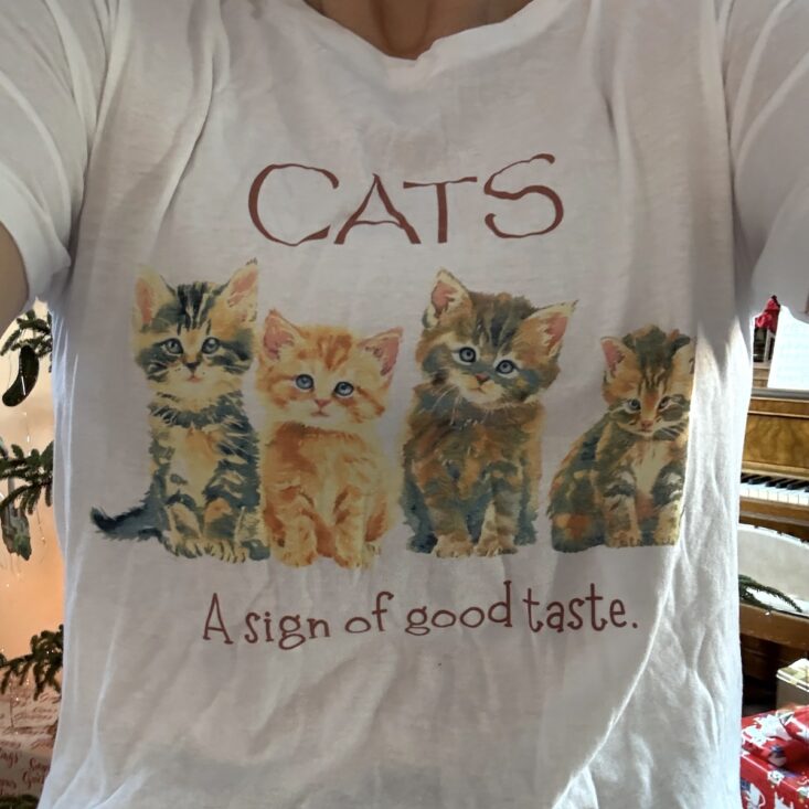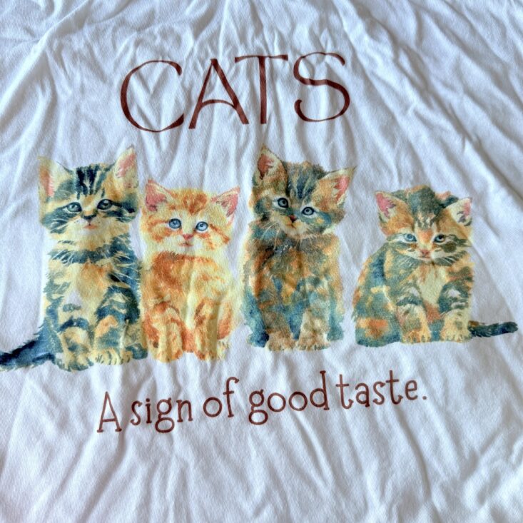The first item we received was a T-shirt! Made from ultra-soft fabric, this tee definitely gives off a vintage vibe with its kitty print. Featuring four fluffy kittens, it brought back all the nostalgia—one of the mama cats I had as a little girl had kittens that looked just like these! Cute in design and paired with a sweet saying, this shirt is sure to elicit lots of comments from my adorable kindergarteners on Monday. Worn with black slacks and my jean jacket, it was the perfect nod to my love of cats—and it’s seriously so comfy to wear!