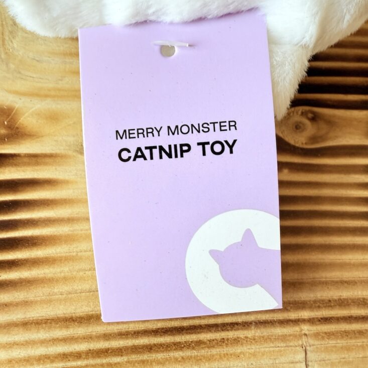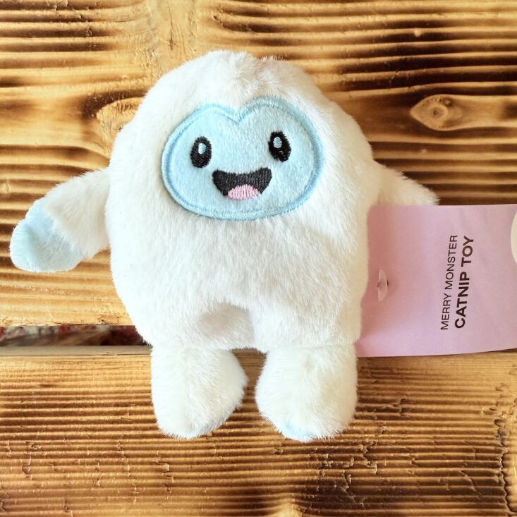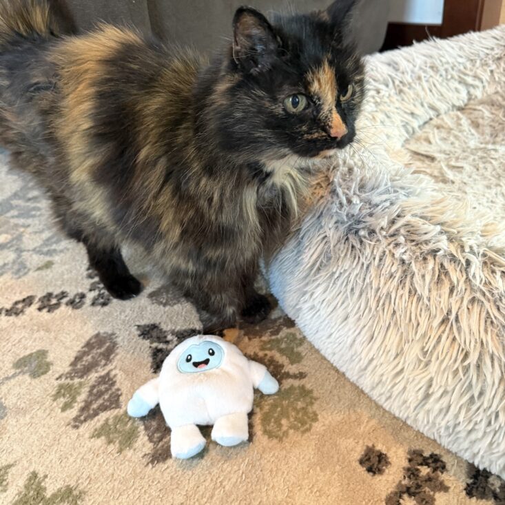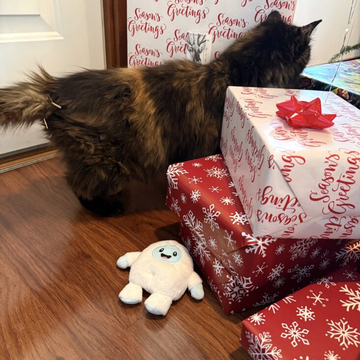 Look at this silly girl! This month, we received two catnip toys, and the first one is shaped like a little yeti monster. White in color and made from soft fleece fabric, the design and embroidery are absolutely adorable. As I’ve mentioned before, Miley can be a bit touch-and-go with toys, and as you can see here, she’s more interested in the Christmas tree and presents than in her own toy. That’s okay, though—the boys like to toss it around for her, and she’s perfectly happy rubbing up against everyone and checking out what’s going on around her.