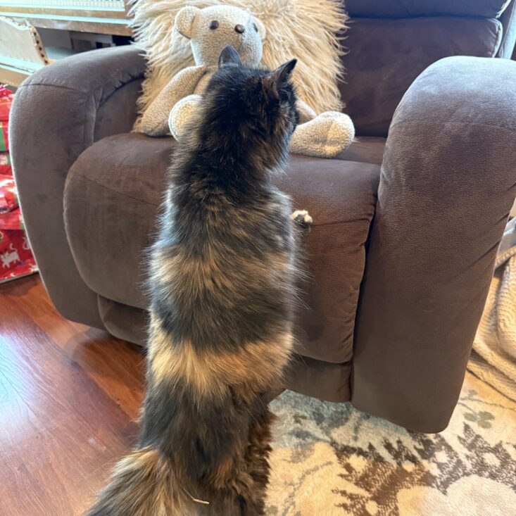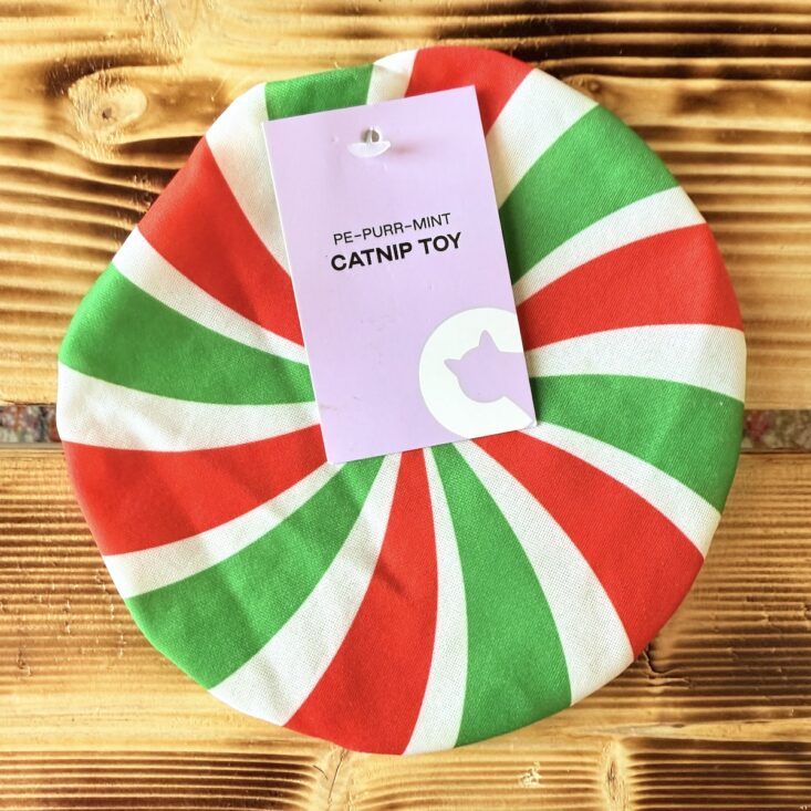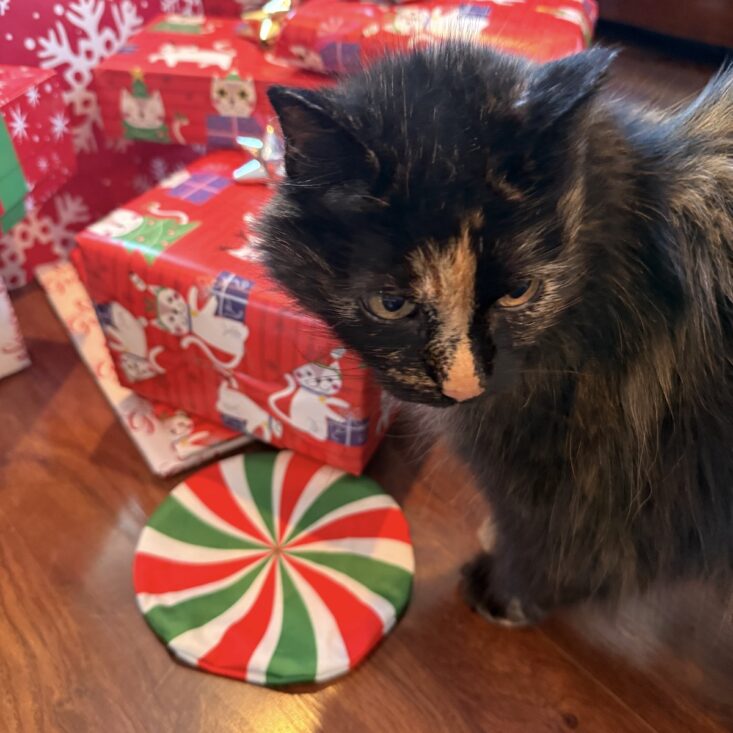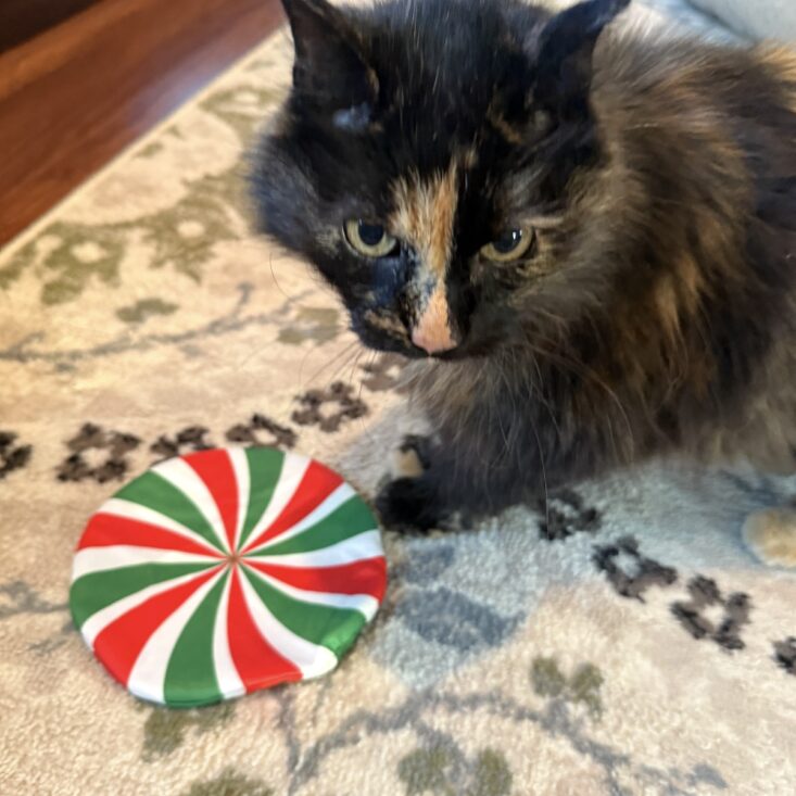 The last item we received was another catnip toy, and Miley did seem to appreciate that it was made from a silky fabric that let some of the catnip dust through. Shaped like a peppermint candy, this toy was very festive and fit our Christmas décor perfectly. While Miley didn’t really play with this toy, she did lay on it for a bit—and it looks adorable next to our Christmas presents!